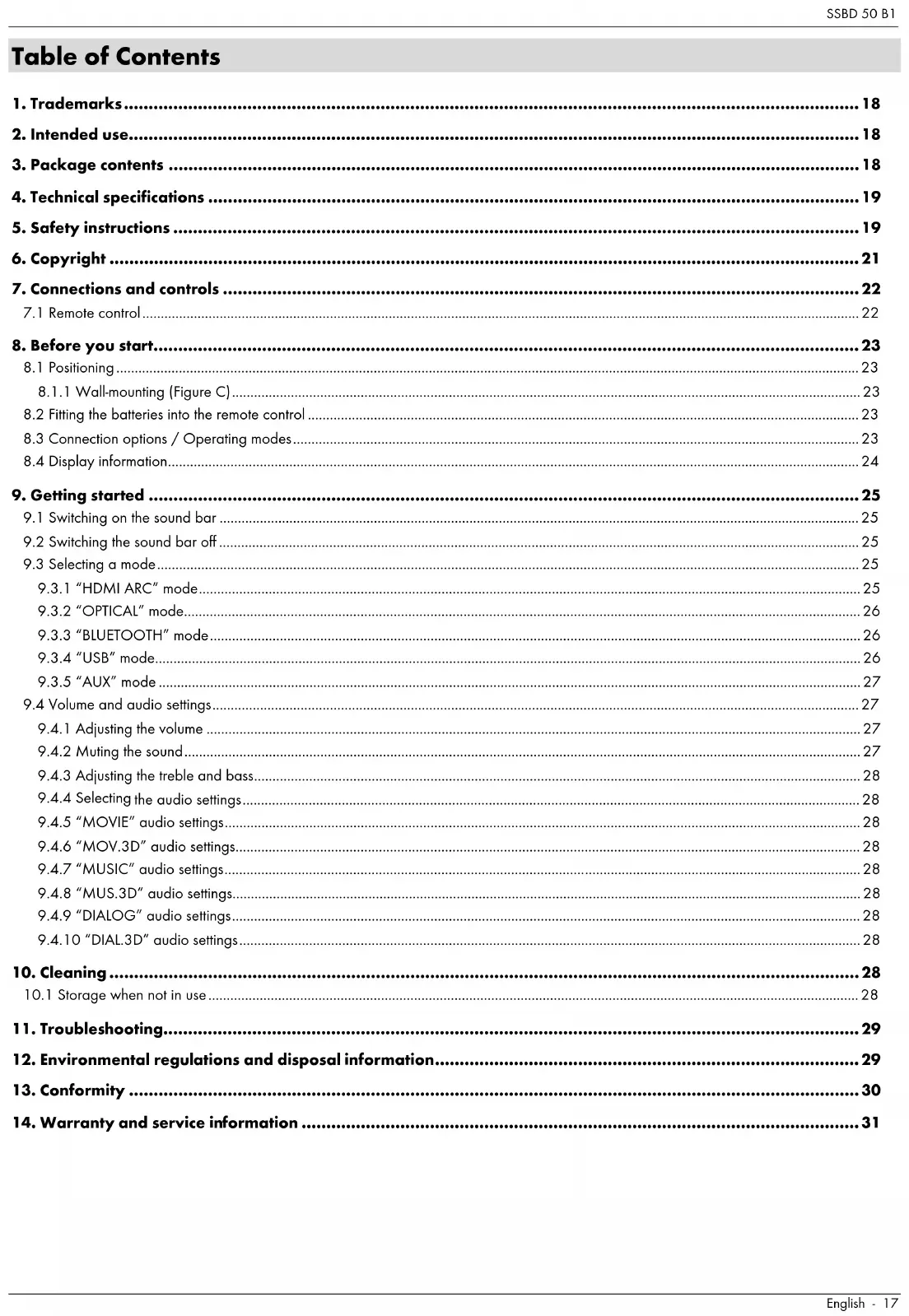 If the sound bar is not to be used for an extended period, store it in a clean, dry and cool place. Also remove the batteries from the remote control to prevent any leaking.SSBD 50 B1 English - 29