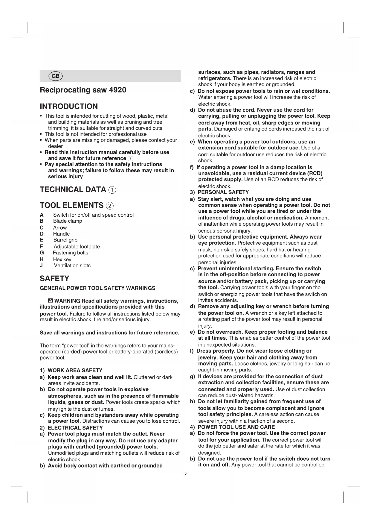 - Pay special attention to the safety instructions and warnings; failure to follow these may result in serious injury TECHNICAL DATA 1 TOOL ELEMENTS 2 A Switch for on/o and speed control B Blade clamp C Arrow D Handle E Barrel grip F Adjustable footplate G Fastening bolts H Hex key J Ventilation slots SAFETY