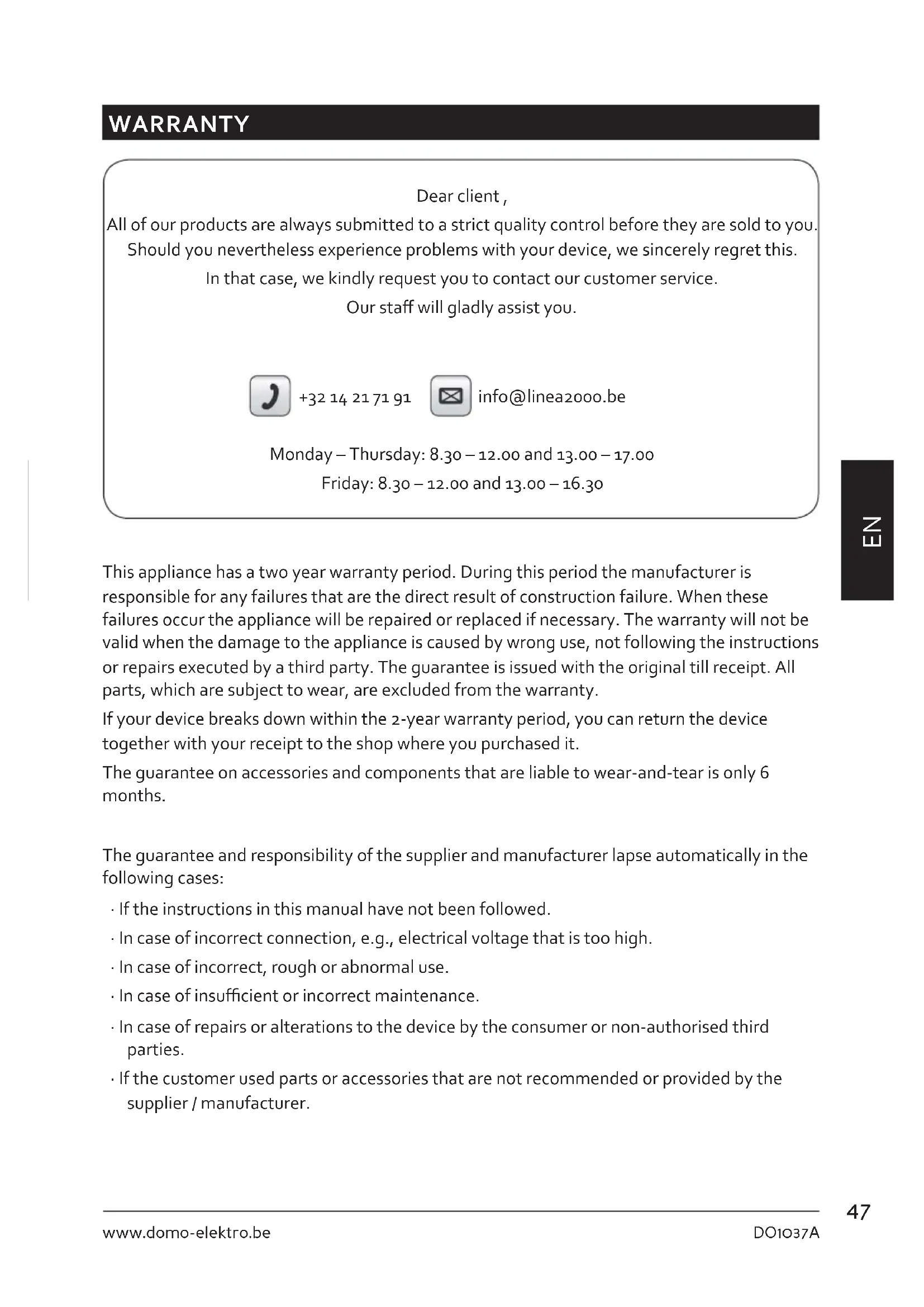 WARRANTY Dear client , All of our products are always submitted to a strict quality control before they are sold to you. Should you nevertheless experience problems with your device, we sincerely regret this. In that case, we kindly request you to contact our customer service. Our sta will gladly assist you. +32 14 21 71 91 info@linea2000.be Monday – Thursday: 8.30 – 12.00 and 13.00 – 17.00 Friday: 8.30 – 12.00 and 13.00 – 16.30 This appliance has a two year warranty period. During this period the manufacturer is responsible for any failures that are the direct result of construction failure. When these failures occur the appliance will be repaired or replaced if necessary. The warranty will not be valid when the damage to the appliance is caused by wrong use, not following the instructions or repairs executed by a third party. The guarantee is issued with the original till receipt. All parts, which are subject to wear, are excluded from the warranty. If your device breaks down within the 2-year warranty period, you can return the device together with your receipt to the shop where you purchased it. The guarantee on accessories and components that are liable to wear-and-tear is only 6 months. The guarantee and responsibility of the supplier and manufacturer lapse automatically in the following cases: