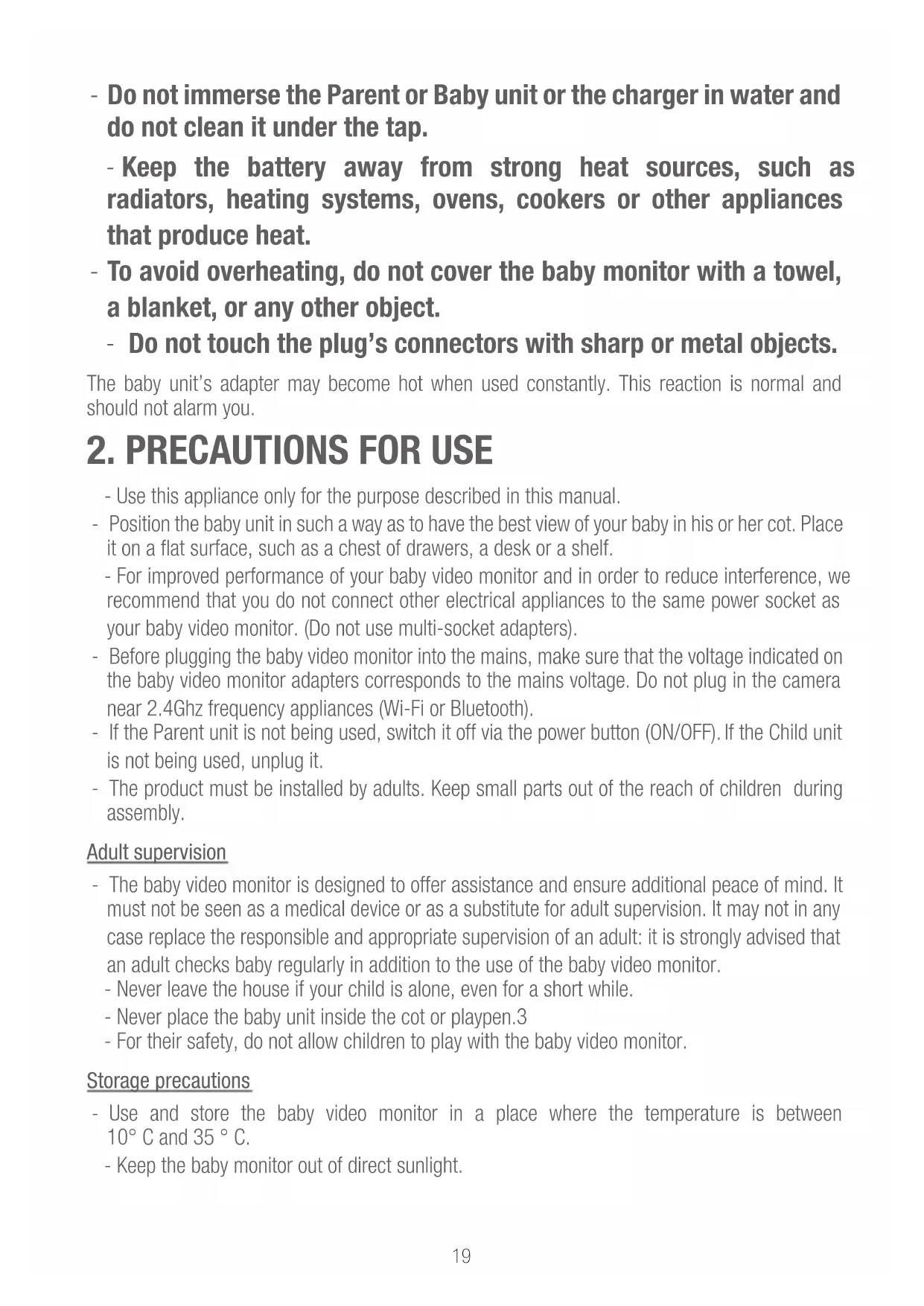 REACH THE ADAPTOR’S WIRE. PLACE THE ADAPTOR AT LEAST 1 METRE FROM THE CHILD. ATTENTION: to avoid the risk of explosion, electric shocks, short-circuits, and overheating: EN19 - Do not immerse the Parent or Baby unit or the charger in water and do not clean it under the tap. - Keep the battery away from strong heat sources, such as radiators, heating systems, ovens, cookers or other appliances that produce heat. - To avoid overheating, do not cover the baby monitor with a towel, a blanket, or any other object. - Do not touch the plug’s connectors with sharp or metal objects. The baby unit’s adapter may become hot when used constantly. This reaction is normal and should not alarm you.