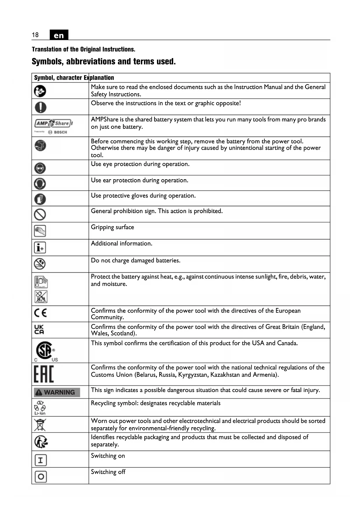 Translation of the Original Instructions. Symbols, abbreviations and terms used. Symbol, character Explanation Make sure to read the enclosed documents such as the Instruction Manual and the General Safety Instructions. Observe the instructions in the text or graphic opposite! AMPShare is the shared battery system that lets you run many tools from many pro brands on just one battery. Before commencing this working step, remove the battery from the power tool. Otherwise there may be danger of injury caused by unintentional starting of the power tool. Use eye protection during operation. Use ear protection during operation. Use protective gloves during operation. General prohibition sign. This action is prohibited. Gripping surface Additional information. Do not charge damaged batteries. Protect the battery against heat, e.g., against continuous intense sunlight, fire, debris, water, and moisture. Confirms the conformity of the power tool with the directives of the European Community. Confirms the conformity of the power tool with the directives of Great Britain (England, Wales, Scotland). This symbol confirms the certification of this product for the USA and Canada. Confirms the conformity of the power tool with the national technical regulations of the Customs Union (Belarus, Russia, Kyrgyzstan, Kazakhstan and Armenia). This sign indicates a possible dangerous situation that could cause severe or fatal injury. Recycling symbol: designates recyclable materials Worn out power tools and other electrotechnical and electrical products should be sorted separately for environmental-friendly recycling. Identifies recyclable packaging and products that must be collected and disposed of separately. Switching on Switching off max.50°C WARNING19