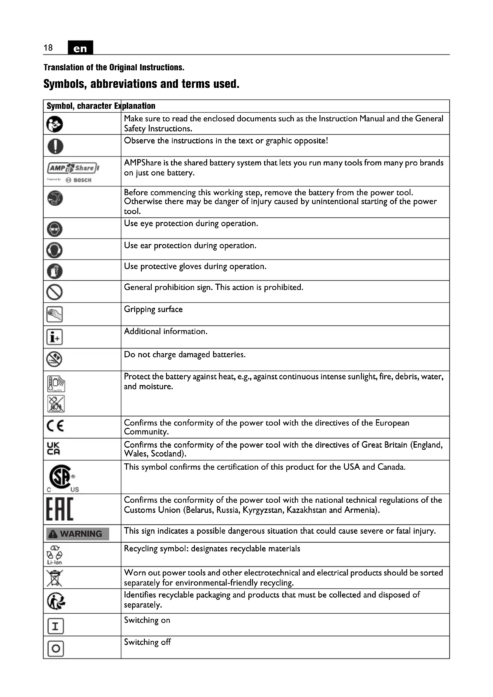 Translation of the Original Instructions. Symbols, abbreviations and terms used. Symbol, character Explanation Make sure to read the enclosed documents such as the Instruction Manual and the General Safety Instructions. Observe the instructions in the text or graphic opposite! AMPShare is the shared battery system that lets you run many tools from many pro brands on just one battery. Before commencing this working step, remove the battery from the power tool. Otherwise there may be danger of injury caused by unintentional starting of the power tool. Use eye protection during operation. Use ear protection during operation. Use protective gloves during operation. General prohibition sign. This action is prohibited. Gripping surface Additional information. Do not charge damaged batteries. Protect the battery against heat, e.g., against continuous intense sunlight, fire, debris, water, and moisture. Confirms the conformity of the power tool with the directives of the European Community. Confirms the conformity of the power tool with the directives of Great Britain (England, Wales, Scotland). This symbol confirms the certification of this product for the USA and Canada. Confirms the conformity of the power tool with the national technical regulations of the Customs Union (Belarus, Russia, Kyrgyzstan, Kazakhstan and Armenia). This sign indicates a possible dangerous situation that could cause severe or fatal injury. Recycling symbol: designates recyclable materials Worn out power tools and other electrotechnical and electrical products should be sorted separately for environmental-friendly recycling. Identifies recyclable packaging and products that must be collected and disposed of separately. Switching on Switching off max.50°C WARNING19