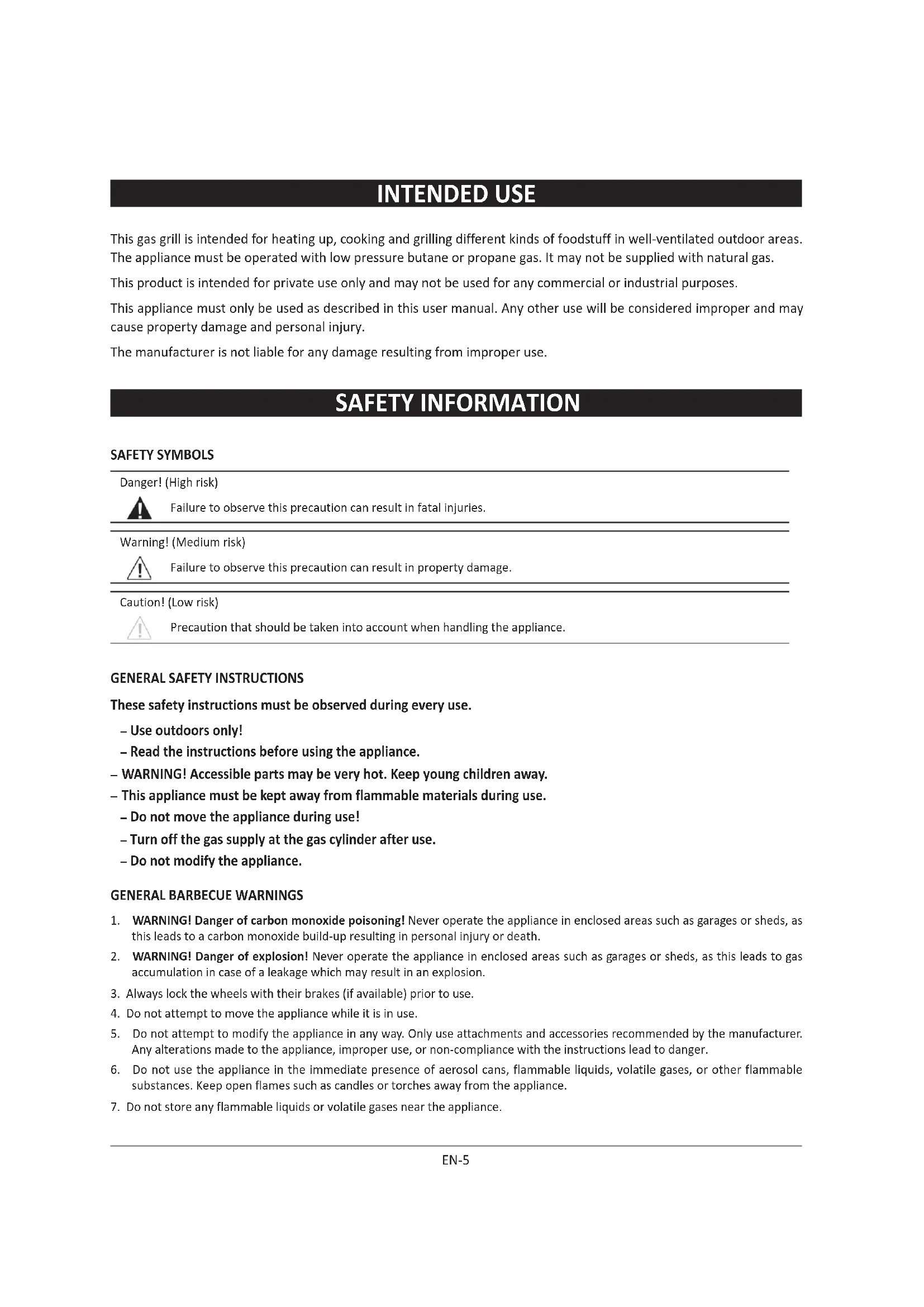 5. Open the cover of the appliance in order to let the gas escape. Should you still smell gas, do not use the appliance any longer and have it repaired by an authorized professional only.EN-7 SAFETY INSTRUCTIONS Danger! Risk of fire! The grill parts become very hot during use and can cause fire. - Always have a ready-to-use fire extinguisher and a first aid kit at hand in the event of an accident or fire. - Place the grill on a secure, non-flammable, flat, level, stable, heat-resistant and clean surface away from any heat source prior to use. - Ensure that the grill is set up at least 1 m away from highly combustible materials such as awnings, wooden terraces or furniture. - Do not move the grill during use. - Some foods produce flammable fats and juices. Clean the grill on a regular basis, preferably after each use. - Do not leave the operating grill unattended. Danger! Risk of fire! Never attempt to switch on/light the grill with the lid closed. - Only operate the gas grill with the lid closed at a low flame. Danger! Risk of burns and accidents! This appliance is not intended for use by persons (including children) with reduced physical, sensory or mental capabilities, or lack of experience and/or knowledge. - This group of people must be informed about the dangers associated with the use of the appliance and must be supervised by a person responsible for their safety. - Supervise children at all times to ensure that they do not play with the appliance. - Any modifications to the product may be extremely hazardous and are therefore prohibited. Do not attempt to make unauthorized modifications to the appliance. In the event of damage, repairs or other problems with the grill, please contact our service center or a local dealer. - Keep the appliance away from children and pets. Do not touch the grill, flame burner and food being grilled during use as they become extremely hot and can cause severe burns. - Keep sufficient distance from hot parts since any contact can cause severe burns. - Always wear grill or oven gloves (e.g. Category II heat-resistant gloves rated according to DIN-EN 407) when grilling. - Use only long-handled grill utensils with heat-resistant grips. - Do not wear clothing with wide sleeves. - Allow the grill to cool down completely before cleaning it or stowing it away. Danger! Risk of deflagration! When poured into the flames, flammable liquids create flashes or deflagrations. - Never use flammable fluids such as gasoline or spirit. Danger! Risk of poisoning! Gas is odorless and can be deadly in enclosed spaces! - The grill is intended for outdoor use only. Danger! Health risk! Do not use paint solvents or thinners to remove stains. These substances are hazardous to health and must not come into contact with food.: Danger! Risks to children! Children playing with the packaging film can get caught in it, which can result in suffocation. - Do not let children play with the packaging film. - Do not let children put small assembly parts into their mouths as these present a choking hazard. The parts can cause choking if swallowed.EN-8 Danger! Risk of injury! Both the grill and individual parts have some sharp edges. - Individual parts of the grill must be handled with care to prevent accidents or injuries during assembly and use. Wear safety gloves where necessary. - Do not set up the grill near entryways or high-traffic zones. - Utmost care must be exercised when grilling. You may lose control of the appliance if distracted. - Always be attentive to and aware of what you are doing. Do not use this product if you are unfocused or tired, or if you are under the influence of drugs, alcohol, or medicines. Just one moment of carelessness during use of the product can cause serious injuries. Warning! Risk of damage! During use, the screws can loosen slowly and impair the grill's stability. - Check the tightness of screws before each use. If necessary, re-tighten all screws to ensure the grill stands stable at all times. Warning! Risk of damage! Do not use any strong or abrasive solvents or scouring pads as these can damage the surfaces and leave scuff marks. Danger! Risk of burns and accidents! Caution! If you smell gas: - Immediately shut off gas to the appliance. - Extinguish any open flame. - Open the lid. - If odour continues, keep away from the appliance and immediately call your gas supplier or fire department. Danger! Risk of burns and accidents! The grill must be stored away from fuels (e.g. gasoline) or other flammable liquids or gases. - Gas cylinders must be stored separately from the gas grill. - Gas cylinders must be stored away from the gas grill. - Do not place gas cylinders directly under the gas grill. Danger! Risk of fire! This appliance must be kept away from flammable materials during use. - Changing the gas cylinder must be carried out away from any source of ignition. - Gas cylinders must never be stored at temperatures exceeding 50 °C. On extremely hot days, efforts should be made to keep the cylinders in the shade.EN-9