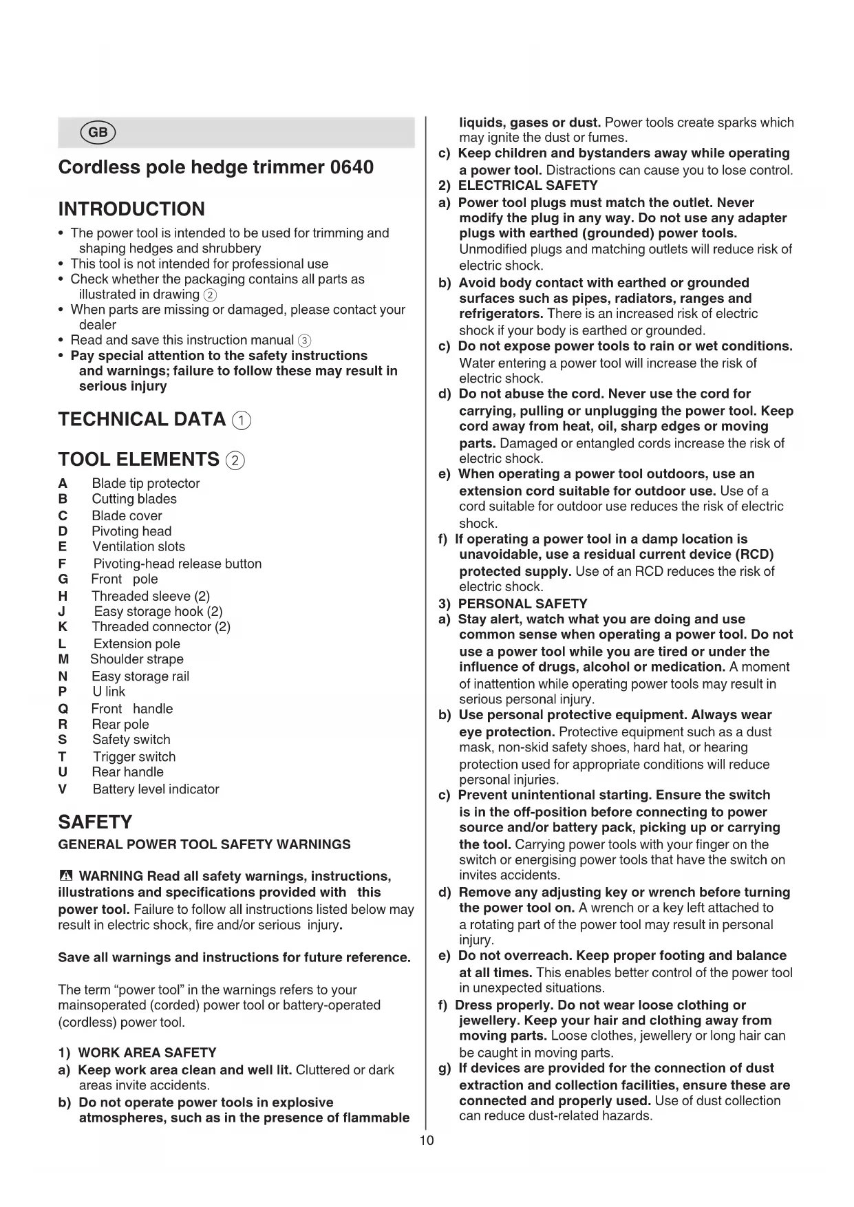 - Pay special attention to the safety instructions and warnings; failure to follow these may result in serious injury TECHNICAL DATA 1 TOOL ELEMENTS 2 A Blade tip protector B Cutting blades C Blade cover D Pivoting head E Ventilation slots F Pivoting-head release button G Front pole H Threaded sleeve (2)