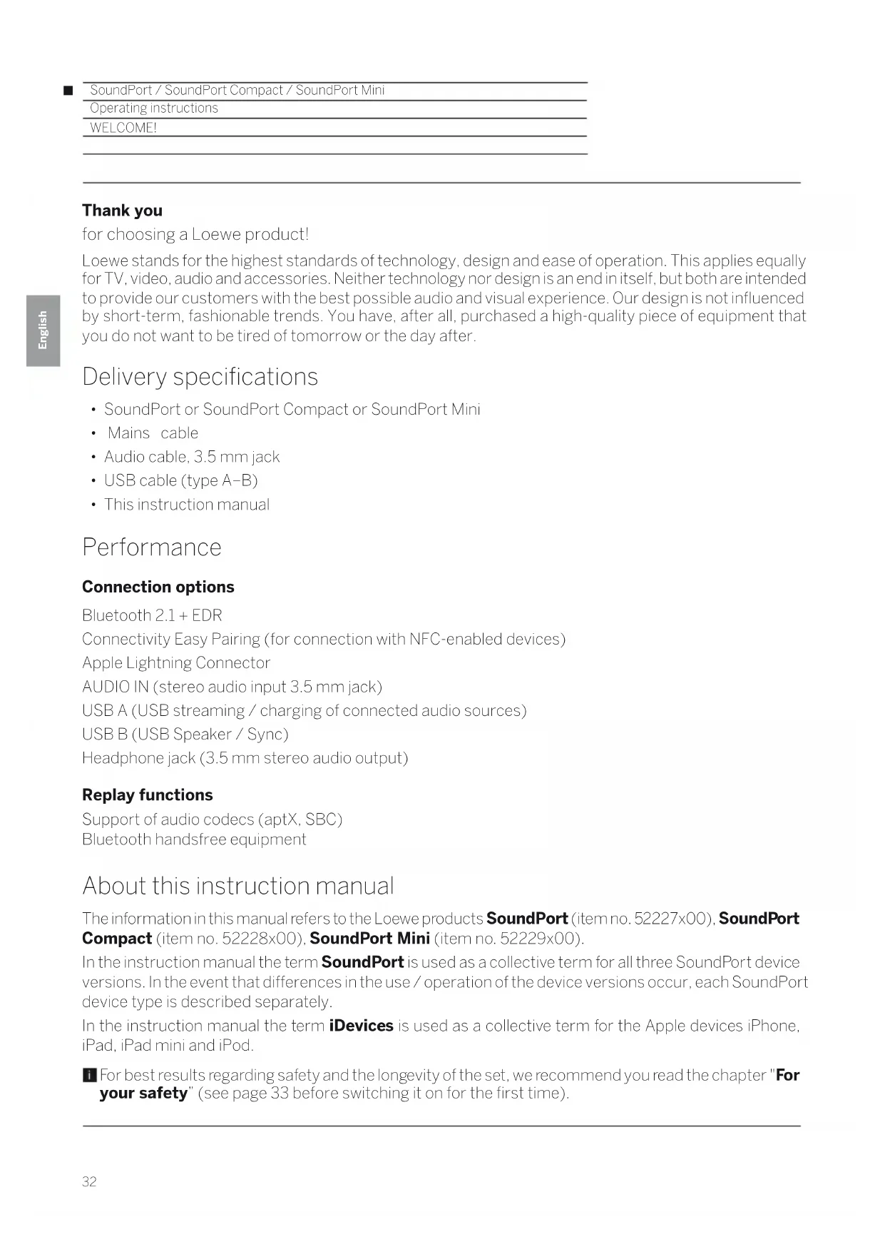 - This instruction manual Performance Connection options Bluetooth 2.1 + EDR Connectivity Easy Pairing (for connection with NFC-enabled devices) Apple Lightning Connector AUDIO IN (stereo audio input 3.5 mm jack) USB A (USB streaming / charging of connected audio sources) USB B (USB Speaker / Sync) Headphone jack (3.5 mm stereo audio output) Replay functions Support of audio codecs (aptX, SBC) Bluetooth handsfree equipment About this instruction manual The information in this manual refers to the Loewe products SoundPort (item no. 52227x00), SoundPort Compact (item no. 52228x00), SoundPort Mini (item no. 52229x00). In the instruction manual the term SoundPort is used as a collective term for all three SoundPort device versions. In the event that differences in the use / operation of the device versions occur, each SoundPort device type is described separately. In the instruction manual the term iDevices is used as a collective term for the Apple devices iPhone, iPad, iPad mini and iPod. For best results regarding safety and the longevity of the set, we recommend you read the chapter "For your safety” (see page 33 before switching it on for the first time).SoundPort / SoundPort Compact / SoundPort Mini Operating instructions English