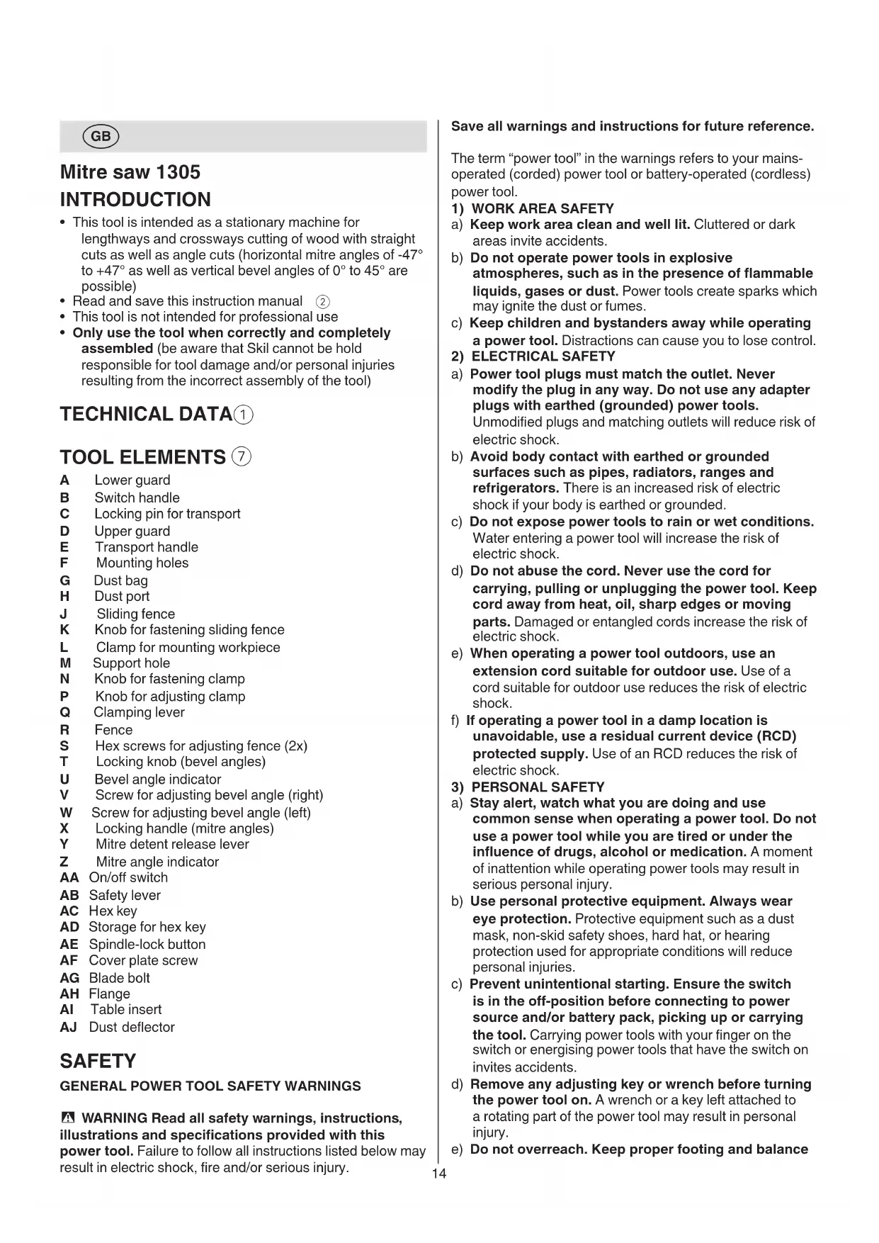 A Lower guard B Switch handle C Locking pin for transport D Upper guard E Transport handle F Mounting holes G Dust bag H Dust port J Sliding fence K Knob for fastening sliding fence L Clamp for mounting workpiece M Support hole N Knob for fastening clamp P Knob for adjusting clamp Q Clamping lever R Fence S Hex screws for adjusting fence (2x) T Locking knob (bevel angles) U Bevel angle indicator V Screw for adjusting bevel angle (right) W Screw for adjusting bevel angle (left) X Locking handle (mitre angles) Y Mitre detent release lever Z Mitre angle indicator AA On/o switch AB Safety lever AC Hex key AD Storage for hex key AE Spindle-lock button AF Cover plate screw AG Blade bolt AH Flange AI Table insert AJ Dust deector SAFETY