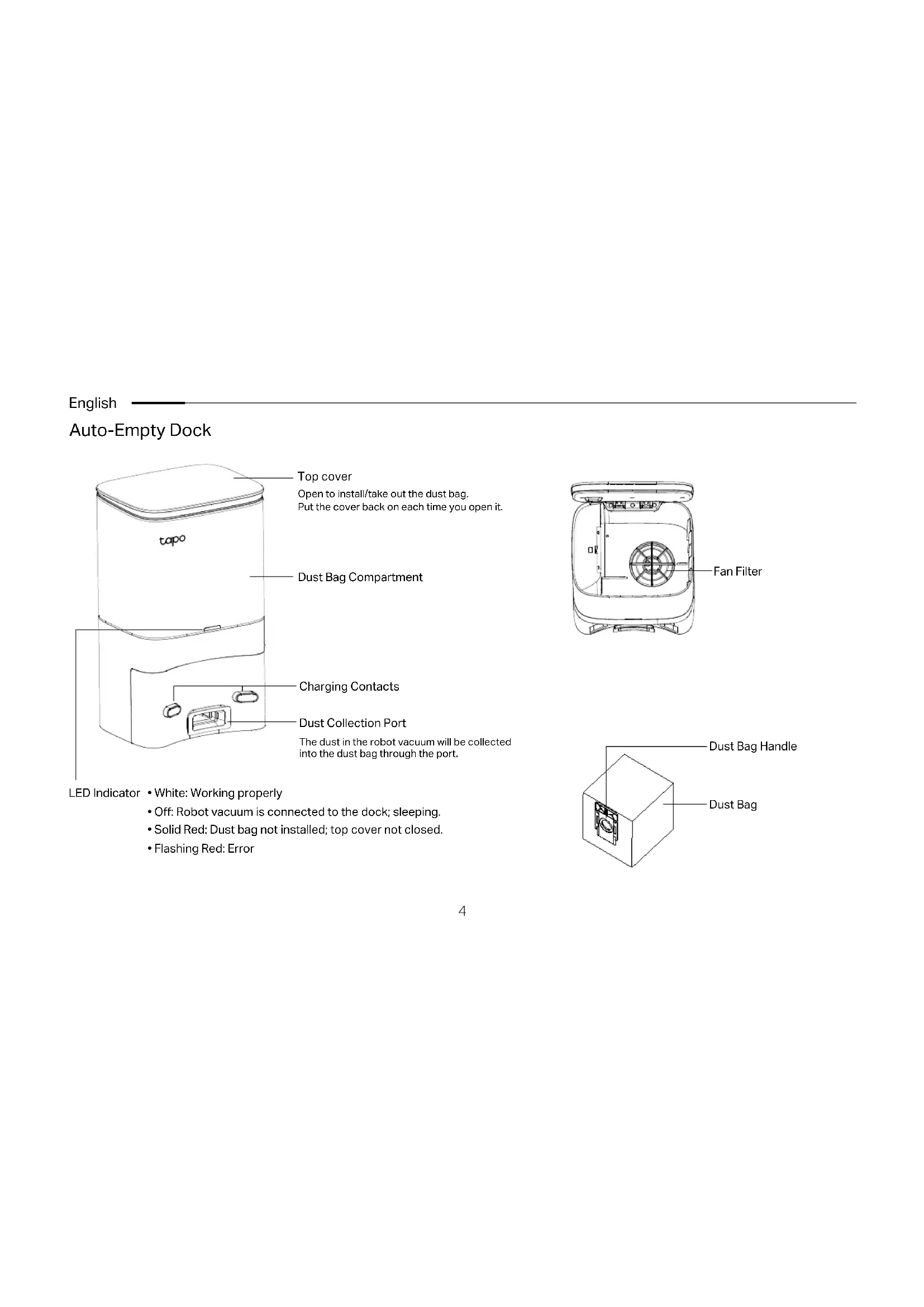 Buttons & LEDs Recharge Sensor Bumper Cover Recharge Sensor Power Switch Dustbin Cli Sensors Side Brush Wheel Caster Wheel Charging Contacts Main Brush Main Brush Cover Latch Filter Latch Dustbin Latch Dust Collection Port Charging Contacts Dust Collection Port Filter Open Dustbin4 English Auto-Empty Dock LED Indicator Top cover Dust Bag Compartment Charging Contacts Dust Collection Port Open to install/take out the dust bag. Put the cover back on each time you open it. The dust in the robot vacuum will be collected into the dust bag through the port.