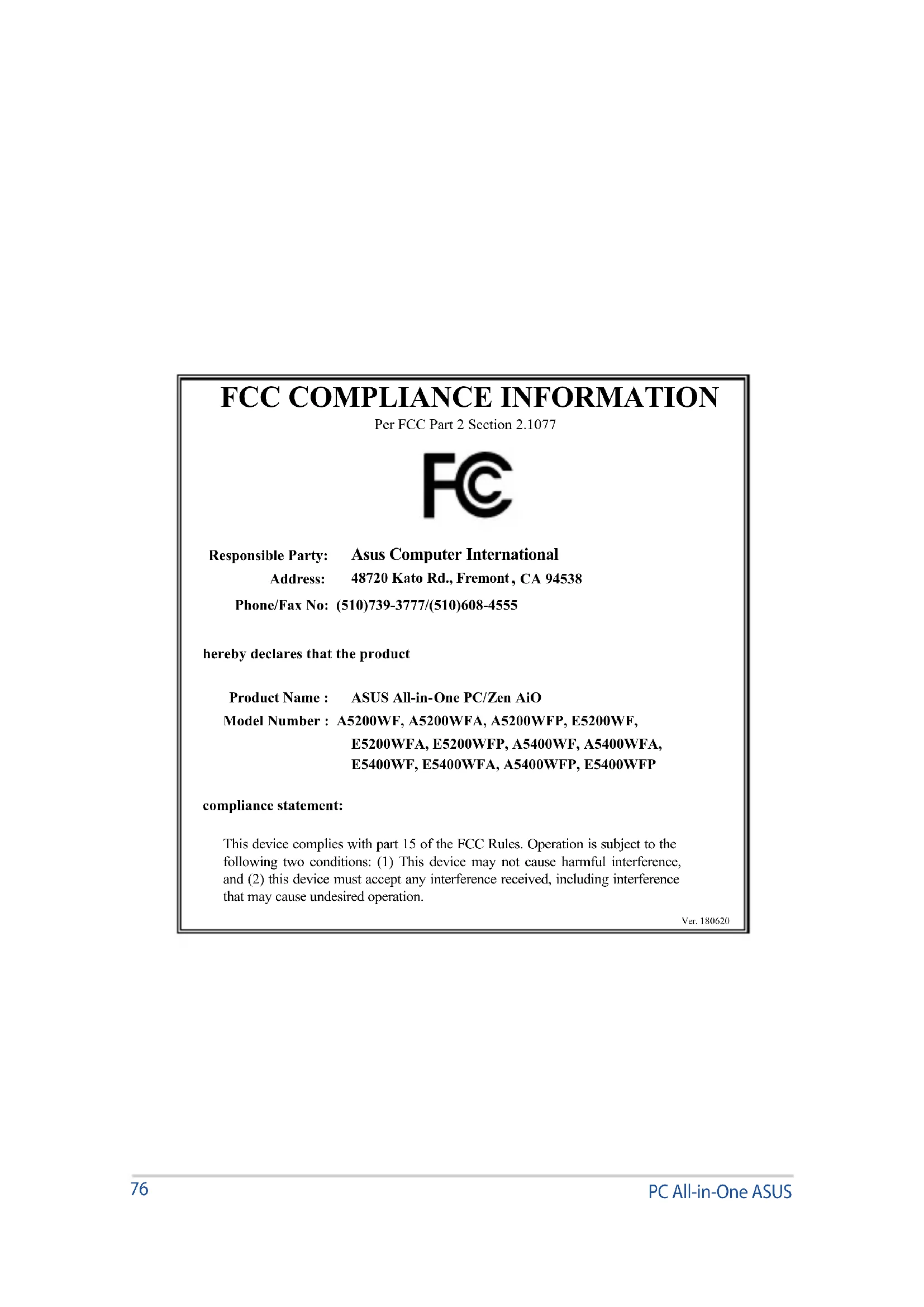 compliance statement: This device complies with part 15 of the FCC Rules. Operation is subject to the following two conditions: (1) This device may not cause harmful interference, and (2) this device must accept any interference received, including interference that may cause undesired operation. Ver. 180620PC All-in-One ASUS 77Fabricant ASUSTek COMPUTER INC. Adresse 1F, No. 15, Lide Rd., Beitou, Taipei 112, Taïwan Numéro de téléphone +886-2-2894-3447 Représentant légal en Europe ASUS COMPUTER GmbH Adresse Harkortstrasse 21-23, 40880 Ratingen, Allemagne