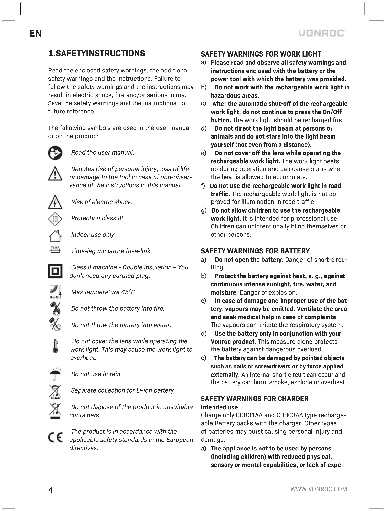 Read the enclosed safety warnings, the additional safety warnings and the instructions. Failure to follow the safety warnings and the instructions may result in electric shock, fire and/or serious injury. Save the safety warnings and the instructions for future reference. The following symbols are used in the user manual or on the product: Read the user manual. Denotes risk of personal injury, loss of life or damage to the tool in case of non-obser- vance of the instructions in this manual. Risk of electric shock. Protection class III. Indoor use only. Time-lag miniature fuse-link. Class II machine - Double insulation – You don’t need any earthed plug. Max temperature 45°C. Do not throw the battery into fire. Do not throw the battery into water. Do not cover the lens while operating the work light. This may cause the work light to overheat. Do not use in rain. Separate collection for Li-ion battery. Do not dispose of the product in unsuitable containers. The product is in accordance with the applicable safety standards in the European directives.