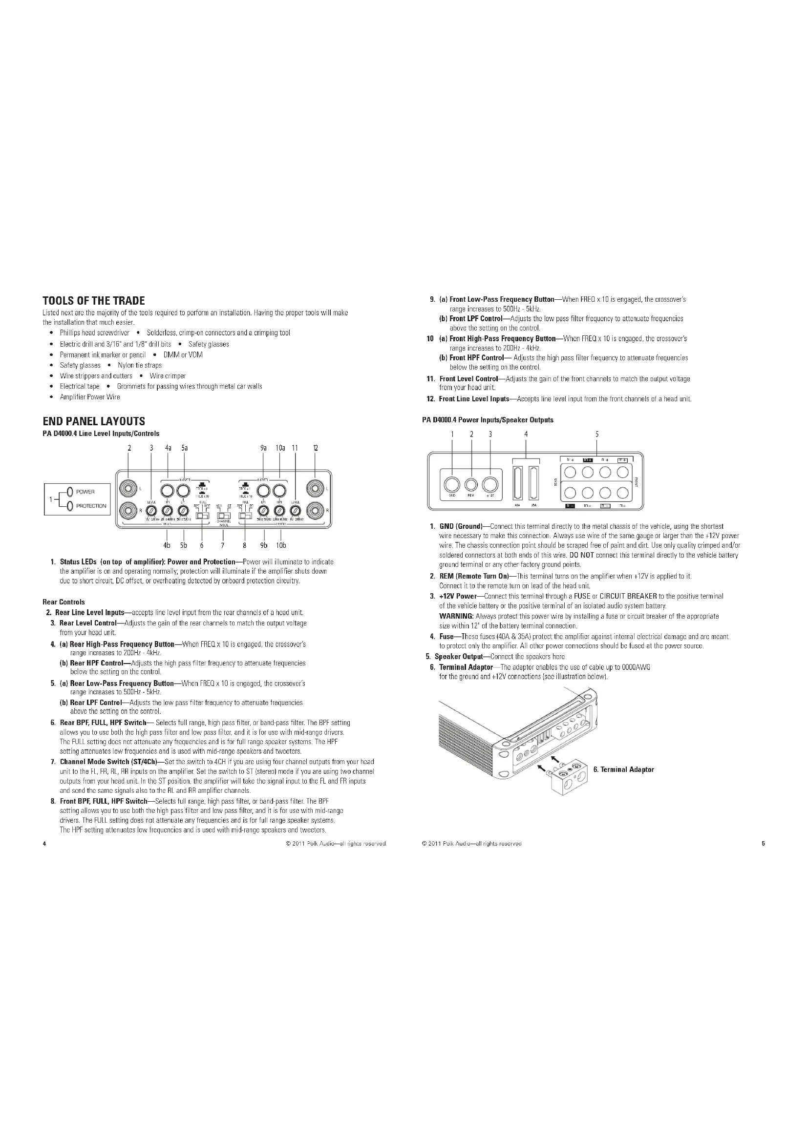 TROUBLESHOOTING TIPS Symptom Probable Cause Action To Take No output Low or no remote turn-on. Check remote turn-on at amplifier and repair as needed. Fuse blown. Check power wire’s integrity and check for speaker shorts. Fix as needed and replace fuse. Power wires not connected. Check power wire and ground connections and repair or replace as needed. Audio input not connected. Check line level connections and repair or replace as needed. Speaker wires not connected. Check speaker wires and repair or replace as needed. Speakers are blown. Check system with known working speaker and repair or replace speakers as needed.10 © 2011 Polk Audio—all rights reserved © 2011 Polk Audio—all rights reserved 11 Audio cycles on and off Thermal protection engages when amplifier heat sink temperature exceeds 85° C (185° F). Make sure there is proper ventilation for amplifier and improve ventilation as needed. Loose or poor audio input. Check line level connections and repair or replace as needed. Loose power connections. Check power wires and ground connections and repair or replace as needed. Distorted output Amplifier level sensitivity set too high exceeding maximum capability of amplifier. Readjust gain. Refer to the Adjusting the Sound of the System section of this manual. Impedance load to amplifier too low. Check speaker impedance load if below (2 Ohms, 4 Ohms min bridged); rewire speakers to create higher impedance. Shorted speaker wires. Check speaker wires and repair or replace as needed. Speaker not connected to amplifier properly. Check speaker wires and repair or replace as needed. Internal crossover not set properly for speakers. Readjust crossovers. Refer to the Line Level Inputs/Controls section of this manual. Speakers are blown. Check system with known working speakers and fix or replace as needed. Poor bass response Speakers wired with wrong polarity causing cancellation at low frequencies. Check speaker polarity and fix as needed. Crossover set incorrectly. Reset crossovers. Refer to the Amplifier Settings section. Impedance load at amplifier is too low. Check speaker impedance load if below (2 Ohms, 4 Ohms min bridged); rewire speakers to create higher impedance. Battery fuse blowing Short in power wire or incorrect wiring. Check power wires and ground connections and repair or replace as needed. Fuse used is smaller than recommended. Replace with proper fuse size. Actual current exceeds fuse rating. Check speaker impedance load if below (2 Ohms, 4 Ohms min bridged); rewire speakers to create higher impedance. Amplifier fuse blowing Fuse used is smaller than recommended. Replace with proper fuse size. Impedance load at amplifier is too low. Check speaker impedance load if below (2 Ohms, 4 Ohms min bridged); rewire speakers to create higher impedance. Speaker is blown with shorted outputs. Check system with known working speakers and fix or replace as needed. Actual current exceeds fuse rating. Check speaker impedance load if below (2 Ohms, 4 Ohms min bridged); rewire speakers to create higher impedance. TROUBLESHOOTING TIPS Symptom Probable Cause Action To Take Amplifier PA D4000.4 Type Bridgeable Class D MOSFET Channels 4 channel RMS Continuous Power @ 4 Ohms 125 W x 4 RMS Continuous Power @ 2 Ohms 200 W x 4 Power Bridged @ 4 Ohms 400 W x 2 Distortion at Rated Power <0.1% Minimum Impedance Bridged 4 Ohms Minimum Impedance NotBridged 2 Ohms Signal-to-noise Ratio 105dB Frequency Response 20Hz-20kHz Damping Factor >100 Crossover Filter Slope (dB/octave) 12 dB/octave Filter Switch (Front) 3-position (HPF, Full, BPF) High Pass Filter Frequency Range (Front) 20Hz - 4kHz Low Pass Filter Frequency Range (Front) 50Hz - 5kHz Front Gain Control 200mV-6V Amplifier PA D4000.4 Filter Switch (Rear) 3-position (HPF, Full, BPF) High Pass Filter Frequency Range (Rear) 20Hz - 4kHz Low Pass Filter Frequency Range (Rear) 50Hz - 5kHz Rear Gain Control 200mV-6V Line Level Inputs (y/n) Yes Line Level Outputs (y/n) No LED Power Indicator Yes LED Protection Indicator Yes SupplyVoltage 10V-16V Fusing & Power/Type (1) 40A (1) 35A ATC Power Connections 4 AWG Ground Connections 4 AWG Speaker Connections 12 AWG Height 113/16"(46mm) Depth 63/4"(171.5mm) Width 1015/16"(277.8mm) Width w/ Terminal Adaptor 1111/16"(296.9mm) Weight 5 lbs (2.7 kg) SPECIFICATIONS12 © 2011 Polk Audio—all rights reserved © 2011 Polk Audio—all rights reserved 13