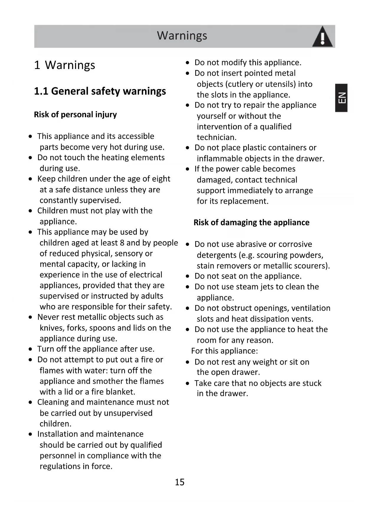 Warnings Warnings regarding the warming drawer when in use.