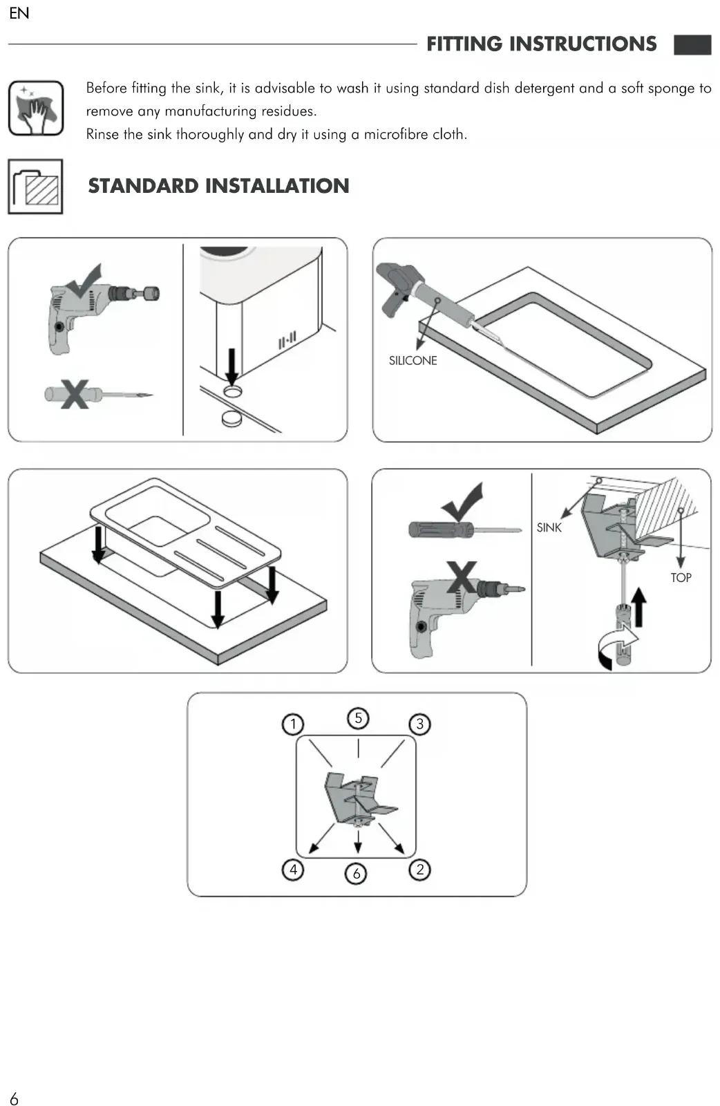 FITTING INSTRUCTIONS Before fitting the sink, it is advisable to wash it using standard dish detergent and a soft sponge to remove any manufacturing residues. Rinse the sink thoroughly and dry it using a microfibre cloth. STANDARD INSTALLATION TOP SINK SILICONE7