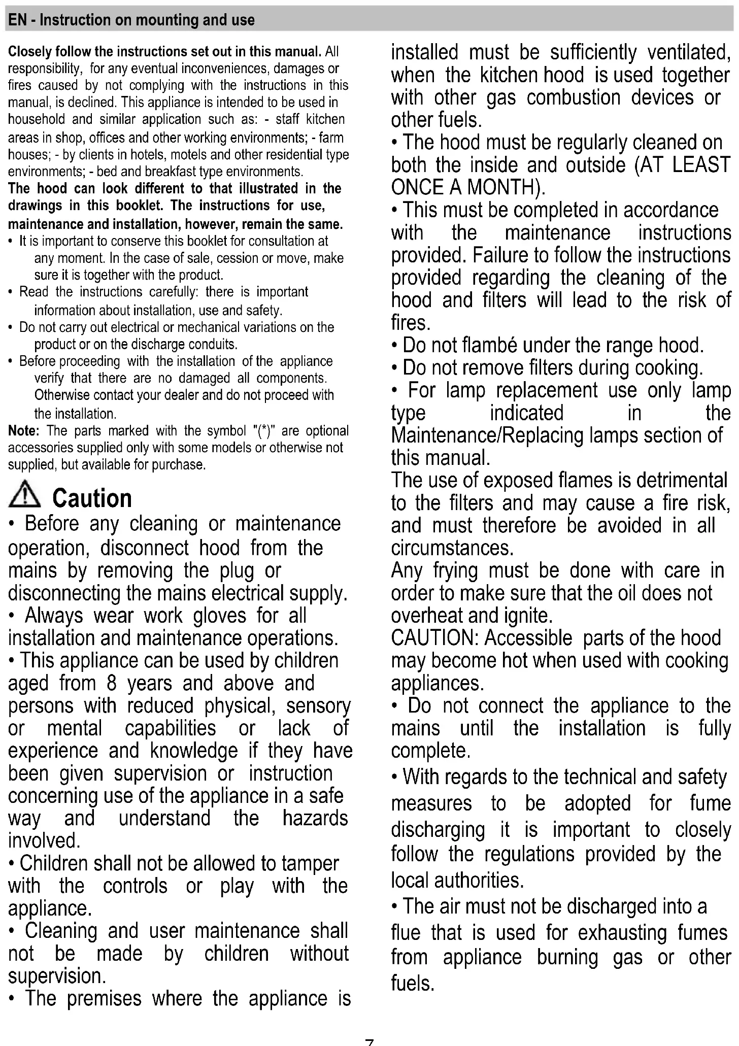 - Before any cleaning or maintenance operation, disconnect hood from the mains by removing the plug or disconnecting the mains electrical supply.