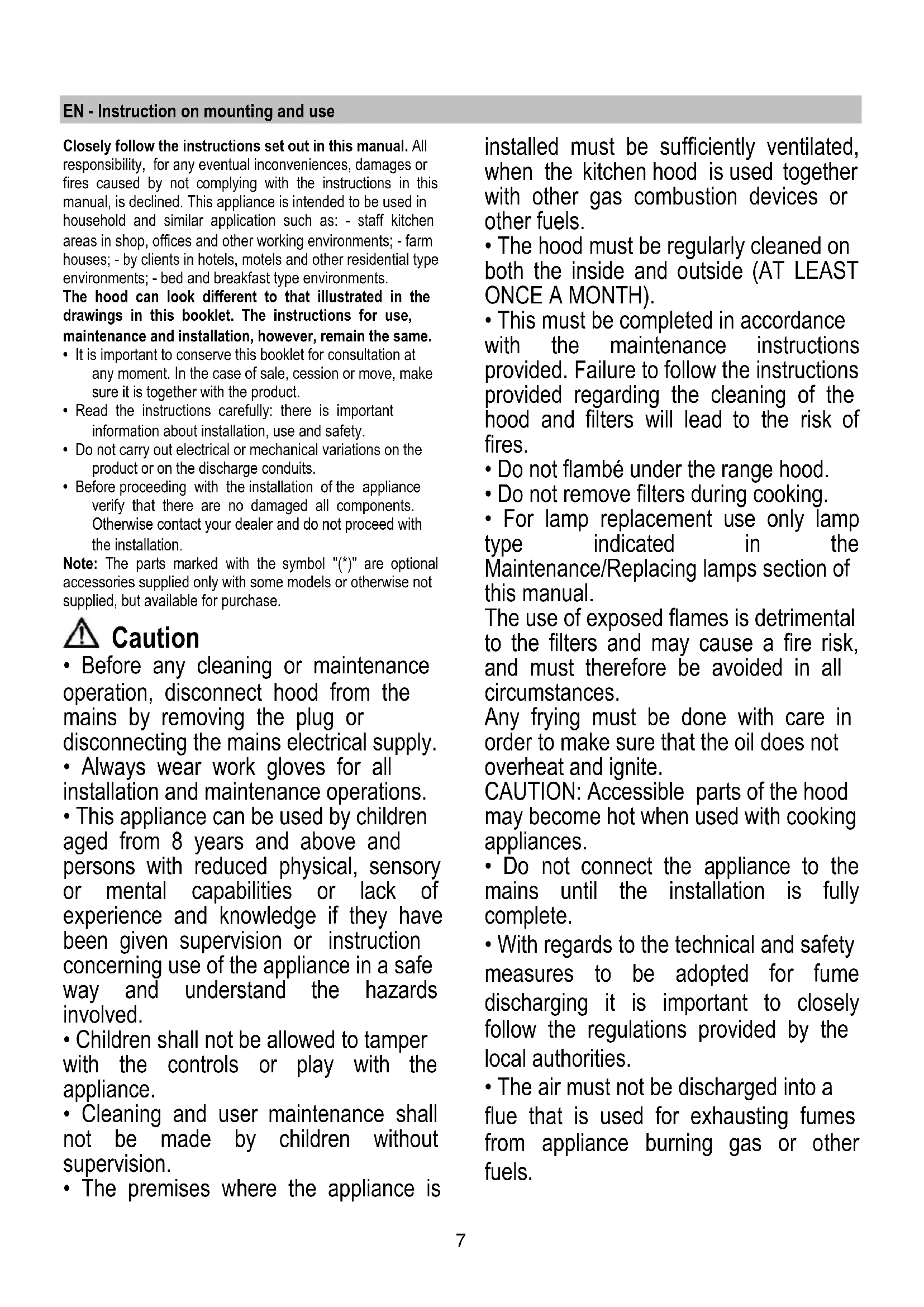 - Before any cleaning or maintenance operation, disconnect hood from the mains by removing the plug or disconnecting the mains electrical supply.