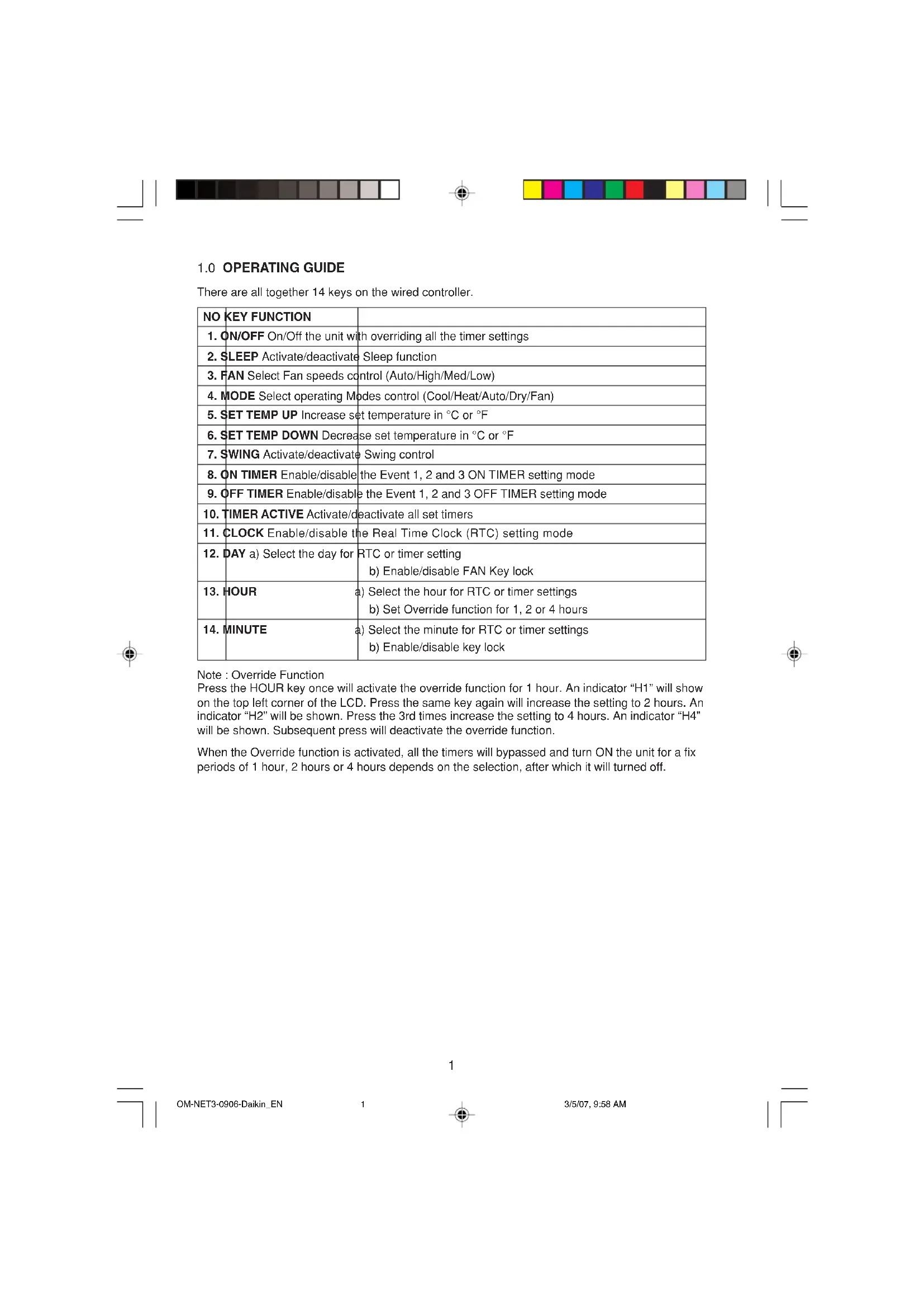 There are all together 14 keys on the wired controller. Note : Override Function Press the HOUR key once will activate the override function for 1 hour. An indicator “H1” will show on the top left corner of the LCD. Press the same key again will increase the setting to 2 hours. An indicator “H2” will be shown. Press the 3rd times increase the setting to 4 hours. An indicator “H4” will be shown. Subsequent press will deactivate the override function. When the Override function is activated, all the timers will bypassed and turn ON the unit for a fix periods of 1 hour, 2 hours or 4 hours depends on the selection, after which it will turned off. OM-NET3-0906-Daikin_EN 3/5/07, 9:58 AM12