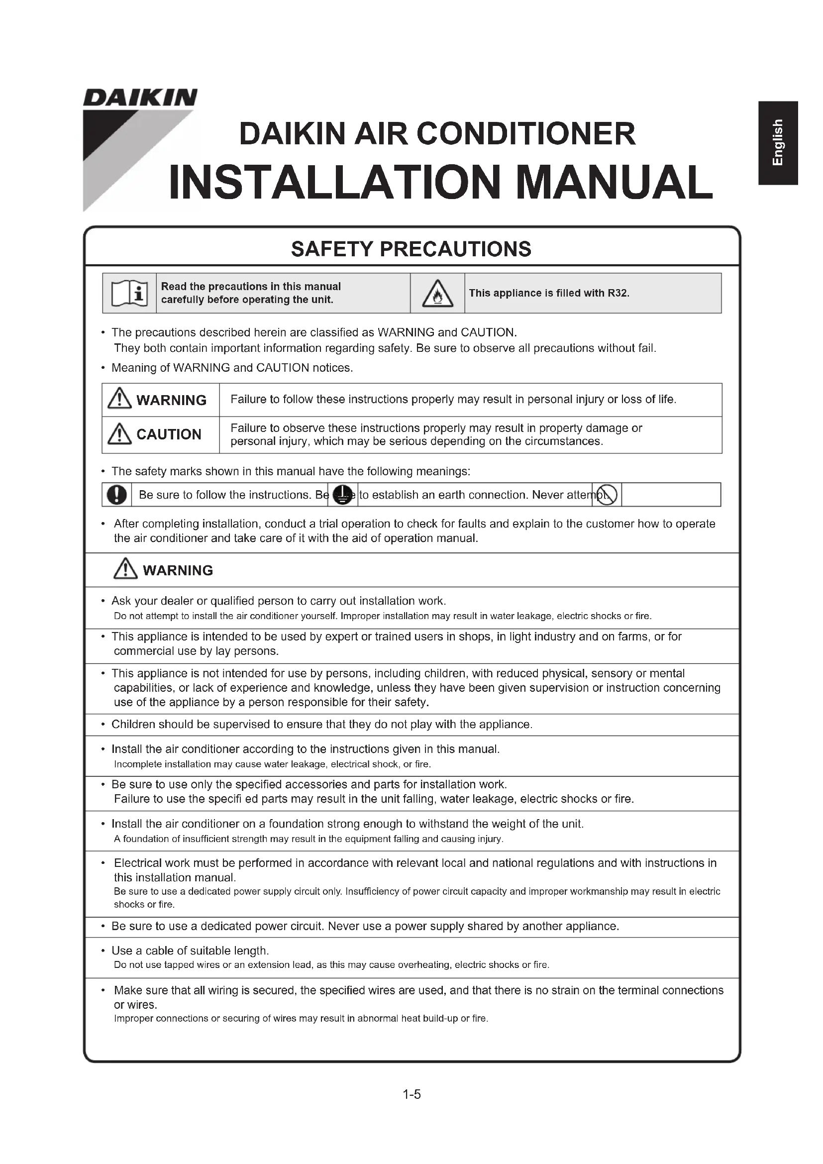 All dimensions are in mm1-5 English SAFETY PRECAUTIONS Read the precautions in this manualcarefully before operating the unit.This appliance is filled with R32.• The precautions described herein are classified as WARNING and CAUTION.They both contain important information regarding safety. Be sure to observe all precautions without fail.• Meaning of WARNING and CAUTION notices. WARNING Failure to follow these instructions properly may result in personal injury or loss of life. CAUTION Failure to observe these instructions properly may result in property damage orpersonal injury, which may be serious depending on the circumstances.• The safety marks shown in this manual have the following meanings:Be sure to follow the instructions. Be sure to establish an earth connection. Never attempt.