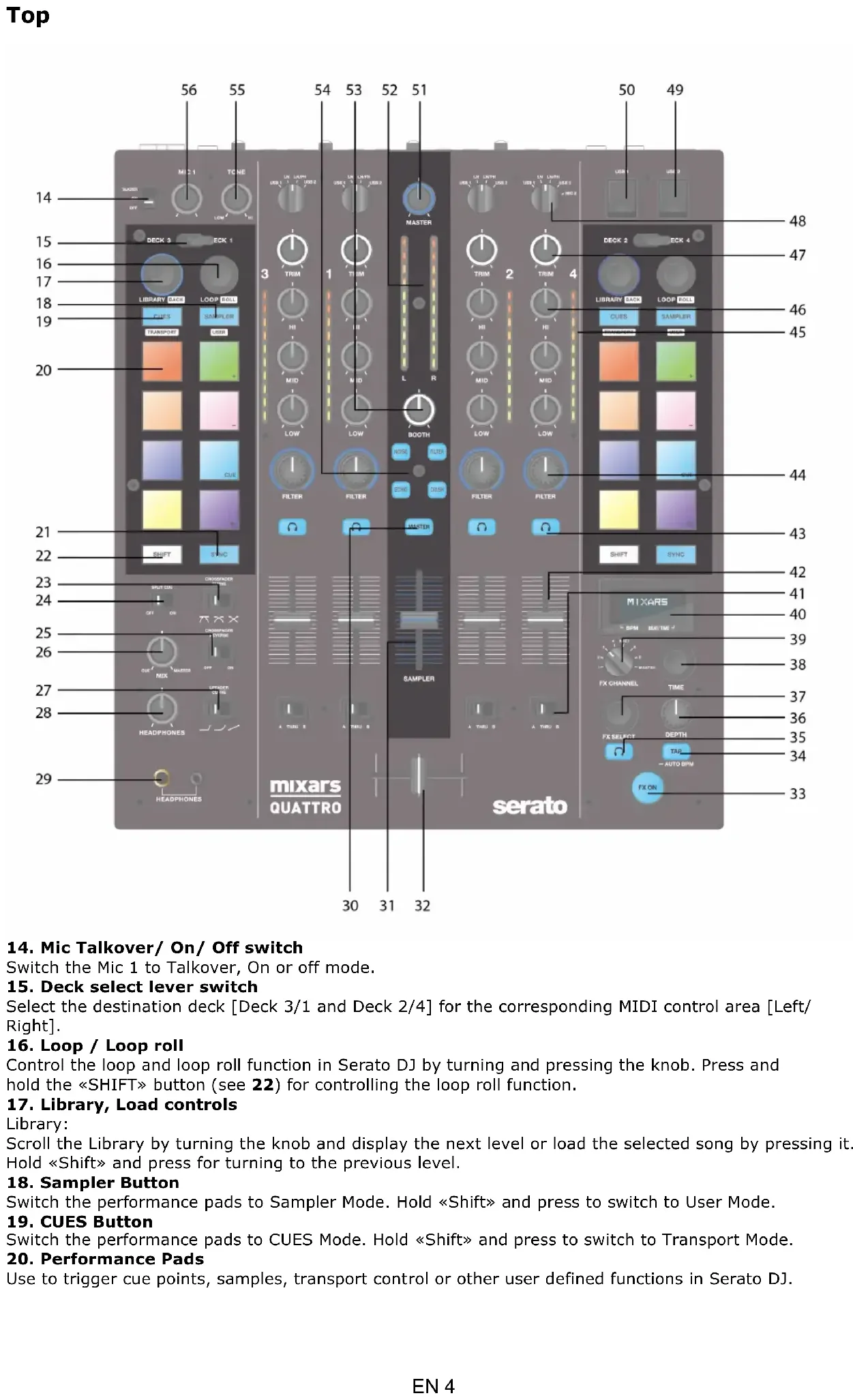 The Mixars Quattro is a class-compliant device for Mac OS X however will require drivers for Windows. Please make sure you have completed driver installation before use with Serato DJ. EN 2B. Controls and functions Rear
