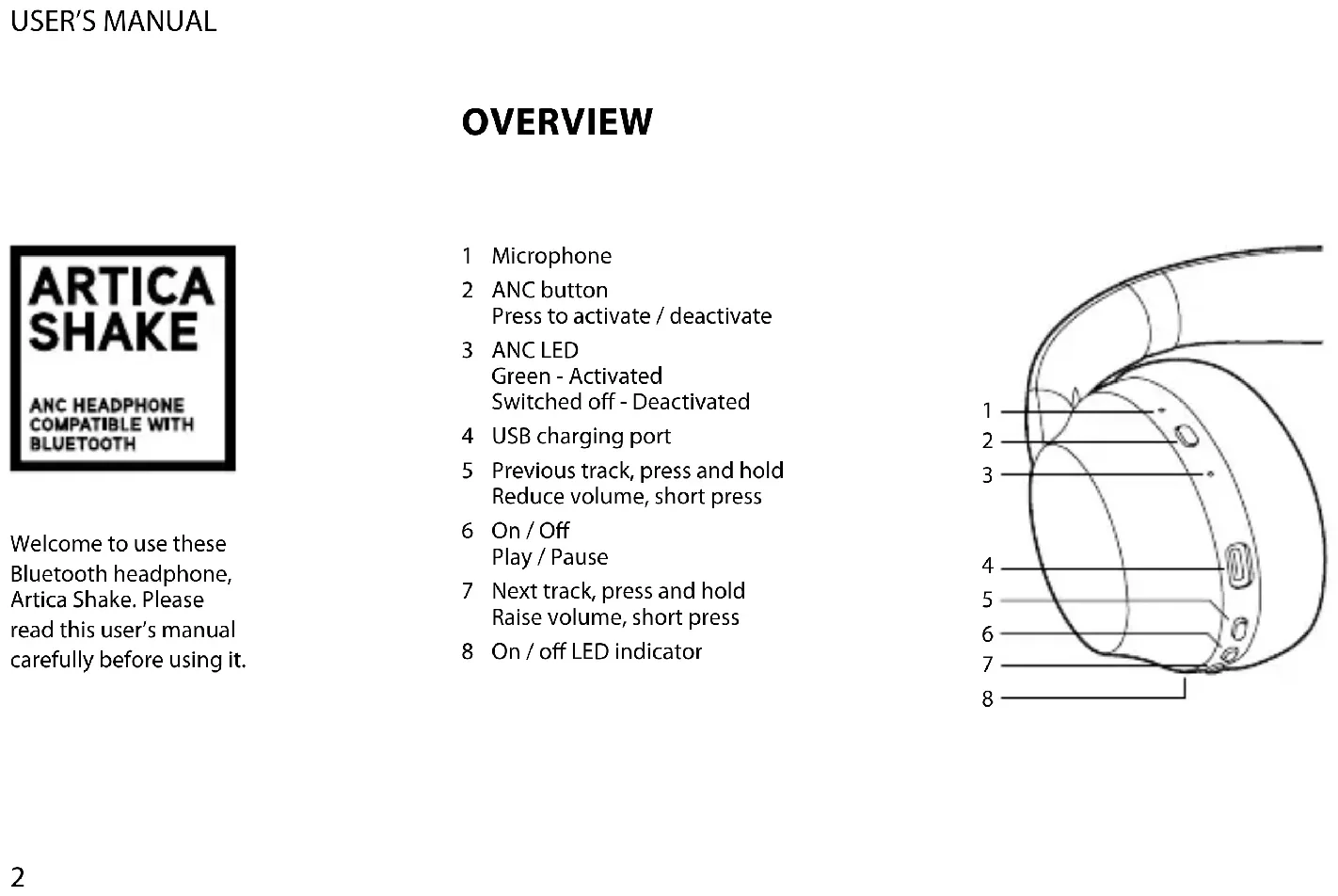 Welcome to use these Bluetooth headphone, Artica Shake. Please read this user’s manual carefully before using it. OVERVIEW Microphone ANC button Press to activate / deactivate ANC LED Green - Activated Switched o - Deactivated USB charging port Previous track, press and hold Reduce volume, short press On / O Play / Pause Next track, press and hold Raise volume, short press On / o LED indicator