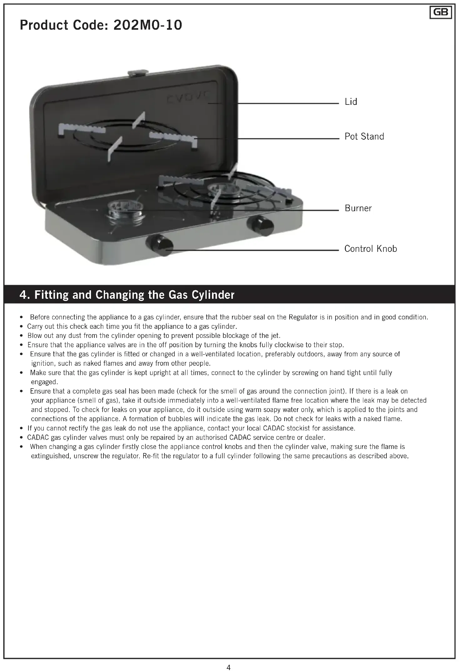 - When changing a gas cylinder rstly close the appliance control knobs and then the cylinder valve, making sure the ame is extinguished, unscrew the regulator. Re-t the regulator to a full cylinder following the same precautions as described above. Product Code: 202M0-10 Lid Pot Stand Burner Control Knob GB55