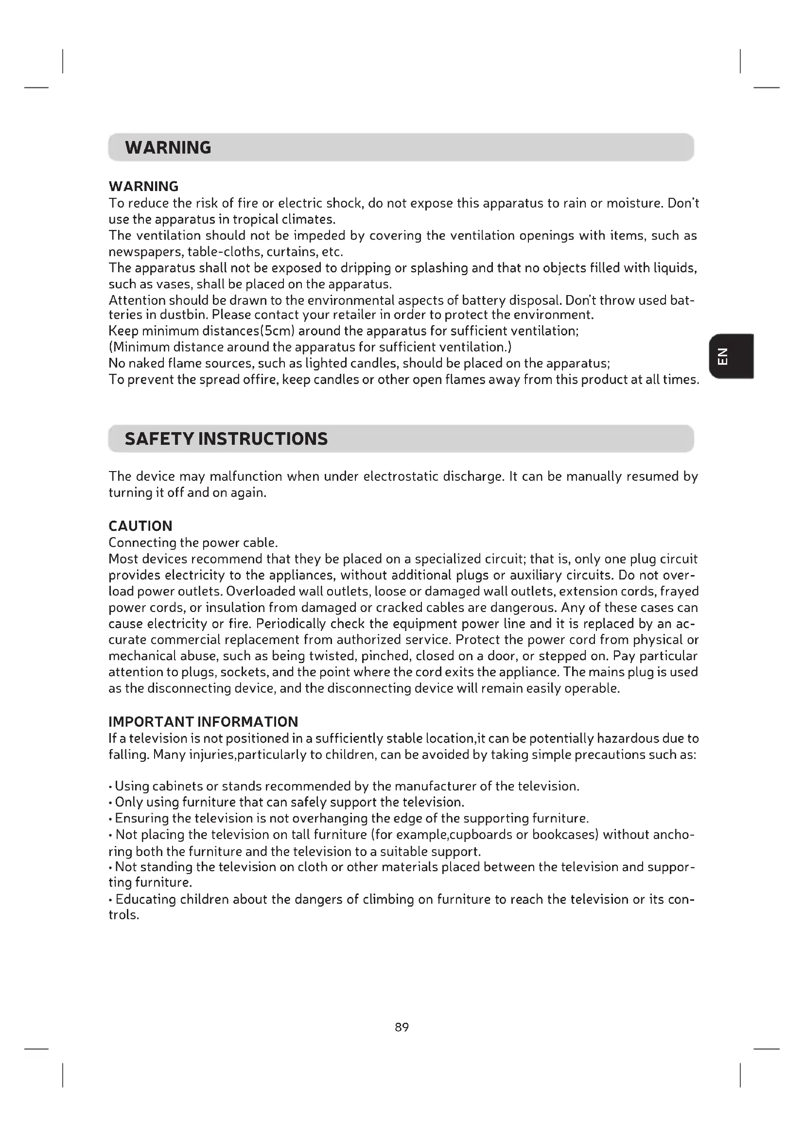 WARNING To reduce the risk of ire or electric shock, do not expose this apparatus to rain or moisture. Don’t use the apparatus in tropical climates. The venilaion should not be impeded by covering the venilaion openings with items, such as newspapers, table-cloths, curtains, etc. The apparatus shall not be exposed to dripping or splashing and that no objects illed with liquids, such as vases, shall be placed on the apparatus. Atenion should be drawn to the environmental aspects of batery disposal. Don’t throw used bat- teries in dustbin. Please contact your retailer in order to protect the environment. Keep minimum distances(5cm) around the apparatus for suicient venilaion; (Minimum distance around the apparatus for suicient venilaion.) No naked lame sources, such as lighted candles, should be placed on the apparatus; To prevent the spread oire, keep candles or other open lames away from this product at all imes. The device may malfuncion when under electrostaic discharge. It can be manually resumed by turning it of and on again. CAUTION Connecing the power cable. Most devices recommend that they be placed on a specialized circuit; that is, only one plug circuit provides electricity to the appliances, without addiional plugs or auxiliary circuits. Do not over- load power outlets. Overloaded wall outlets, loose or damaged wall outlets, extension cords, frayed power cords, or insulaion from damaged or cracked cables are dangerous. Any of these cases can cause electricity or ire. Periodically check the equipment power line and it is replaced by an ac- curate commercial replacement from authorized service. Protect the power cord from physical or mechanical abuse, such as being twisted, pinched, closed on a door, or stepped on. Pay paricular atenion to plugs, sockets, and the point where the cord exits the appliance. The mains plug is used as the disconnecing device, and the disconnecing device will remain easily operable. IMPORTANT INFORMATION If a television is not posiioned in a suiciently stable locaion,it can be potenially hazardous due to falling. Many injuries,paricularly to children, can be avoided by taking simple precauions such as: