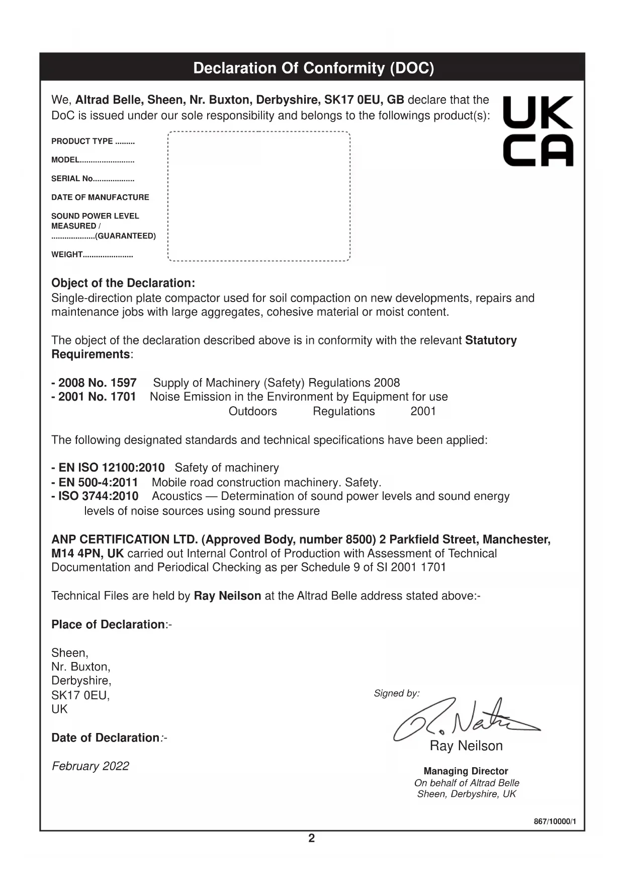 Managing DirectorOn behalf of Altrad BelleSheen, Derbyshire, UK EC Declaration Of Conformity (DOC) Ray Neilson Signed by: We, Altrad Belle, Sheen, Nr. Buxton, Derbyshire, SK17 0EU, GB declare that the DoC is issued under our sole responsibility and belongs to the followings product(s): 866/10000/0_GB GB GB PRODUCT TYPE .....................MODEL.....................................SERIAL No...............................DATE OF MANUFACTURE.....SOUND POWER LEVELMEASURED /....................(GUARANTEED)WEIGHT................................... Object of the Declaration: Single-direction plate compactor used for soil compaction on new developments, repairs and maintenance jobs with large aggregates, cohesive material or moist content. The object of the declaration described above is in conformity with the relevant Union Harmonisation Legislation: - 2006/42/EC New machinery directive - 2000/14/EC Noise - equipment for use outdoors The following harmonised standards and technical specifications have been applied: - EN ISO 12100:2010 Safety of machinery - EN 500-4:2011 Mobile road construction machinery. Safety. - ISO 3744:2010 Acoustics — Determination of sound power levels and sound energy levels of noise sources using sound pressure VINÇOTTE nv/sa (NB0026) carried out Internal Control of Production with Assessment of Technical Documentation and Periodical Checking as per Annex VI of 2000/14/EC Technical Files are held by Hugues Menager at the following address:- Altrad (Group Holding), 125 Rue du Mas Carbonnier, 34000, Montpellier, France. Place of Declaration:- Sheen, Nr. Buxton, Derbyshire, SK17 0EU,