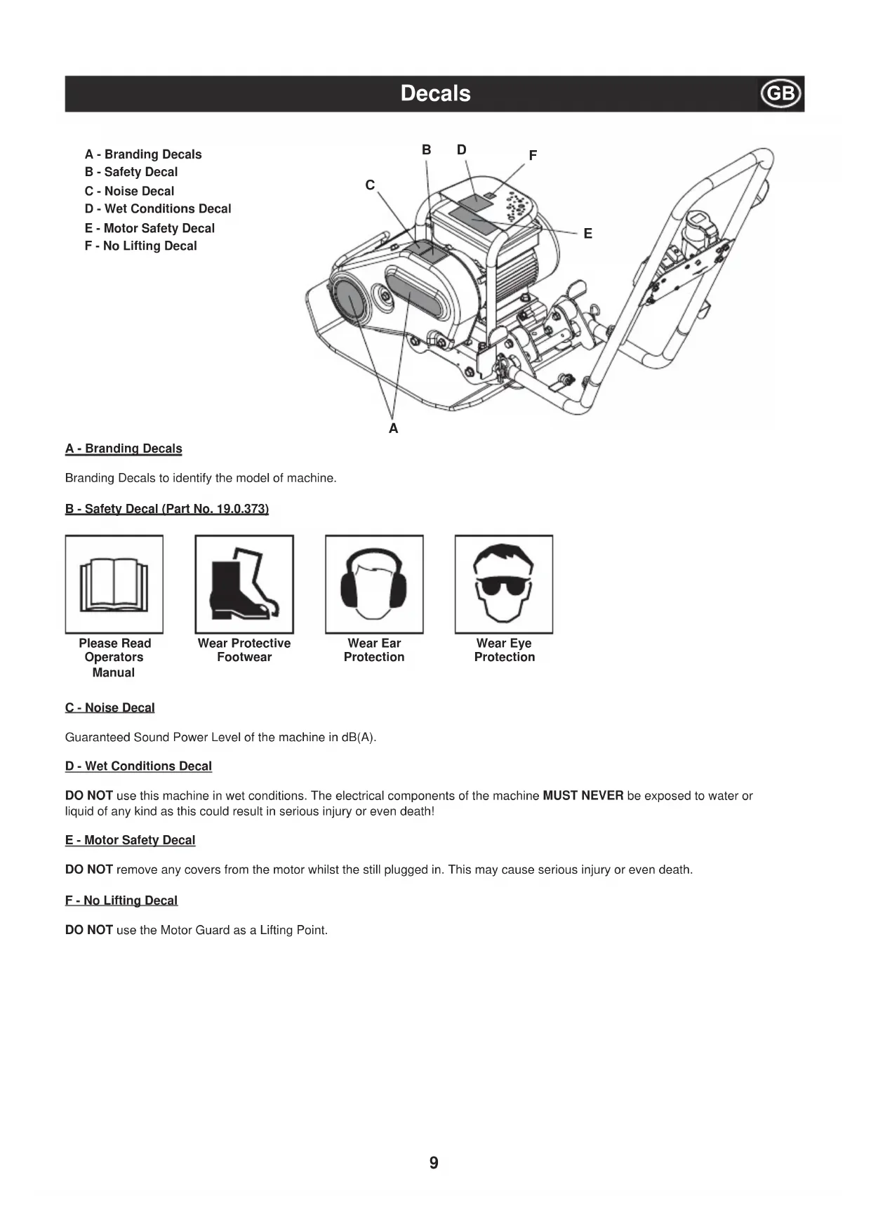 A - Branding Decals Branding Decals to identify the model of machine. B - Safety Decal (Part No. 19.0.373) Please Read Operators Manual Wear Protective Footwear Wear Ear Protection Wear Eye Protection C - Noise Decal Guaranteed Sound Power Level of the machine in dB(A). D - Wet Conditions Decal DO NOT use this machine in wet conditions. The electrical components of the machine MUST NEVER be exposed to water or liquid of any kind as this could result in serious injury or even death! E - Motor Safety Decal DO NOT remove any covers from the motor whilst the still plugged in. This may cause serious injury or even death. F - No Lifting Decal DO NOT use the Motor Guard as a Lifting Point. A - Branding Decals B - Safety Decal C - Noise Decal D - Wet Conditions Decal E - Motor Safety Decal F - No Lifting Decal