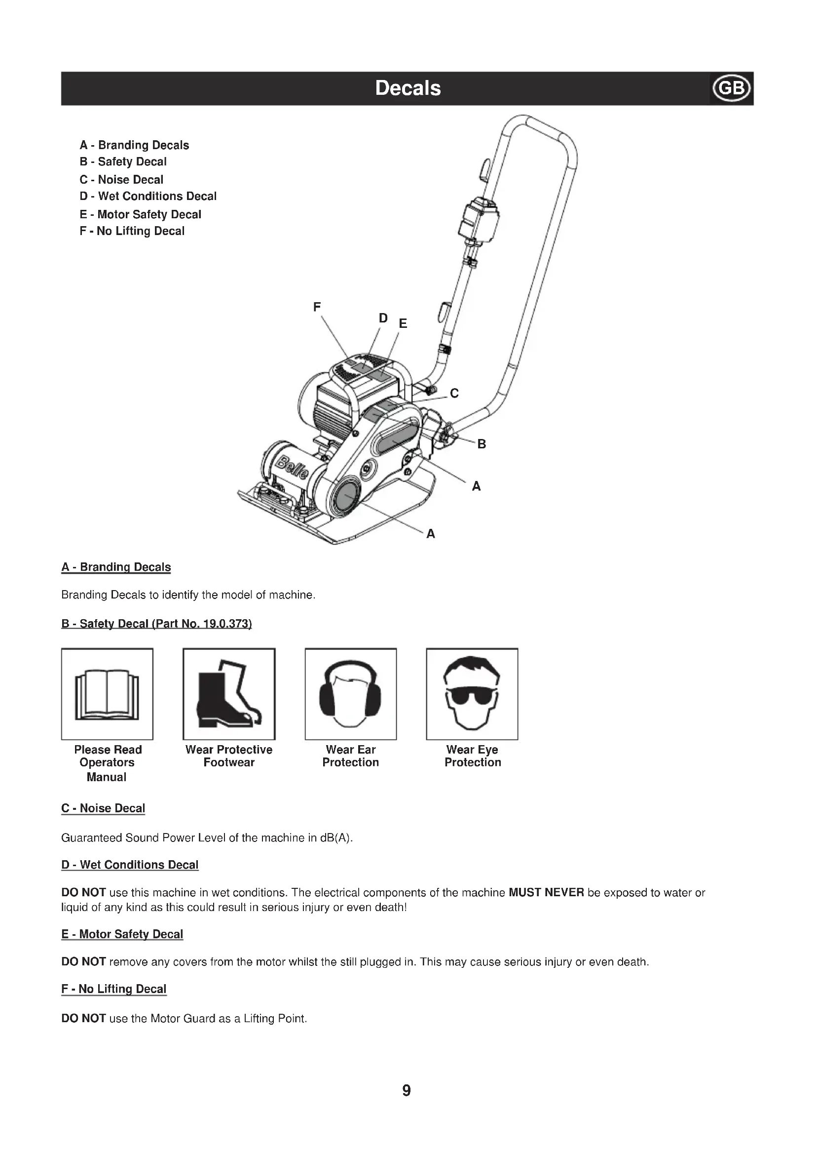 A - Branding Decals Branding Decals to identify the model of machine. B - Safety Decal (Part No. 19.0.373) Please Read Operators Manual Wear Protective Footwear Wear Ear Protection Wear Eye Protection C - Noise Decal Guaranteed Sound Power Level of the machine in dB(A). D - Wet Conditions Decal DO NOT use this machine in wet conditions. The electrical components of the machine MUST NEVER be exposed to water or liquid of any kind as this could result in serious injury or even death! E - Motor Safety Decal DO NOT remove any covers from the motor whilst the still plugged in. This may cause serious injury or even death. F - No Lifting Decal DO NOT use the Motor Guard as a Lifting Point. A - Branding Decals B - Safety Decal C - Noise Decal D - Wet Conditions Decal E - Motor Safety Decal F - No Lifting Decal