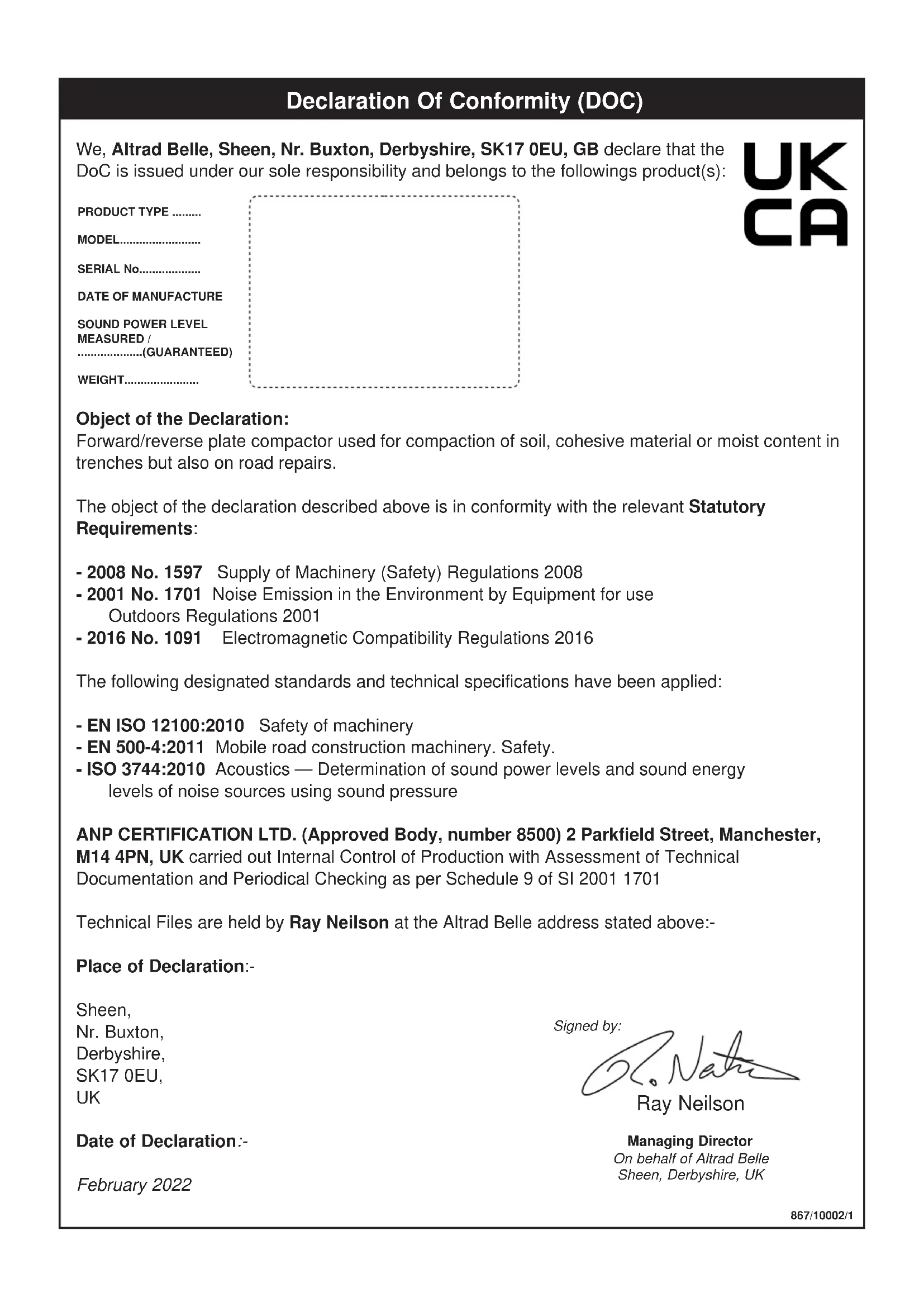 MEASURED / ....................(GUARANTEED) WEIGHT....................... Object of the Declaration: Forward/reverse plate compactor used for compaction of soil, cohesive material or moist content in trenches but also on road repairs. The object of the declaration described above is in conformity with the relevant Statutory Requirements: - 2008 No. 1597 Supply of Machinery (Safety) Regulations 2008 - 2001 No. 1701 Noise Emission in the Environment by Equipment for use Outdoors Regulations 2001 - 2016 No. 1091 Electromagnetic Compatibility Regulations 2016 The following designated standards and technical specifications have been applied: - EN ISO 12100:2010 Safety of machinery - EN 500-4:2011 Mobile road construction machinery. Safety. - ISO 3744:2010 Acoustics — Determination of sound power levels and sound energy levels of noise sources using sound pressure ANP CERTIFICATION LTD. (Approved Body, number 8500) 2 Parkfield Street, Manchester, M14 4PN, UK carried out Internal Control of Production with Assessment of Technical Documentation and Periodical Checking as per Schedule 9 of SI 2001 1701 Technical Files are held by Ray Neilson at the Altrad Belle address stated above:- Place of Declaration:- Sheen, Nr. Buxton, Derbyshire, SK17 0EU,