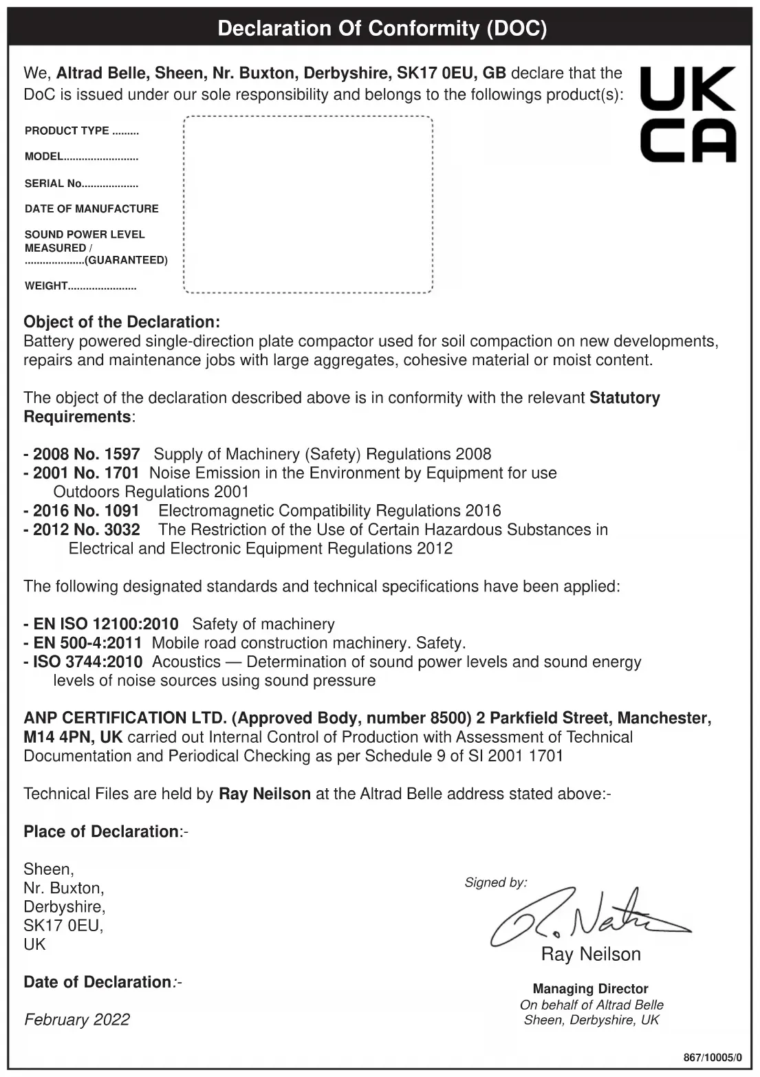 MEASURED / ....................(GUARANTEED) WEIGHT....................... Object of the Declaration: Battery powered single-direction plate compactor used for soil compaction on new developments, repairs and maintenance jobs with large aggregates, cohesive material or moist content. The object of the declaration described above is in conformity with the relevant Statutory Requirements: - 2008 No. 1597 Supply of Machinery (Safety) Regulations 2008 - 2001 No. 1701 Noise Emission in the Environment by Equipment for use Outdoors Regulations 2001 - 2016 No. 1091 Electromagnetic Compatibility Regulations 2016 - 2012 No. 3032 The Restriction of the Use of Certain Hazardous Substances in Electrical and Electronic Equipment Regulations 2012 The following designated standards and technical specifications have been applied: - EN ISO 12100:2010 Safety of machinery - EN 500-4:2011 Mobile road construction machinery. Safety. - ISO 3744:2010 Acoustics — Determination of sound power levels and sound energy levels of noise sources using sound pressure ANP CERTIFICATION LTD. (Approved Body, number 8500) 2 Parkfield Street, Manchester, M14 4PN, UK carried out Internal Control of Production with Assessment of Technical Documentation and Periodical Checking as per Schedule 9 of SI 2001 1701 Technical Files are held by Ray Neilson at the Altrad Belle address stated above:- Place of Declaration:- Sheen, Nr. Buxton, Derbyshire, SK17 0EU,