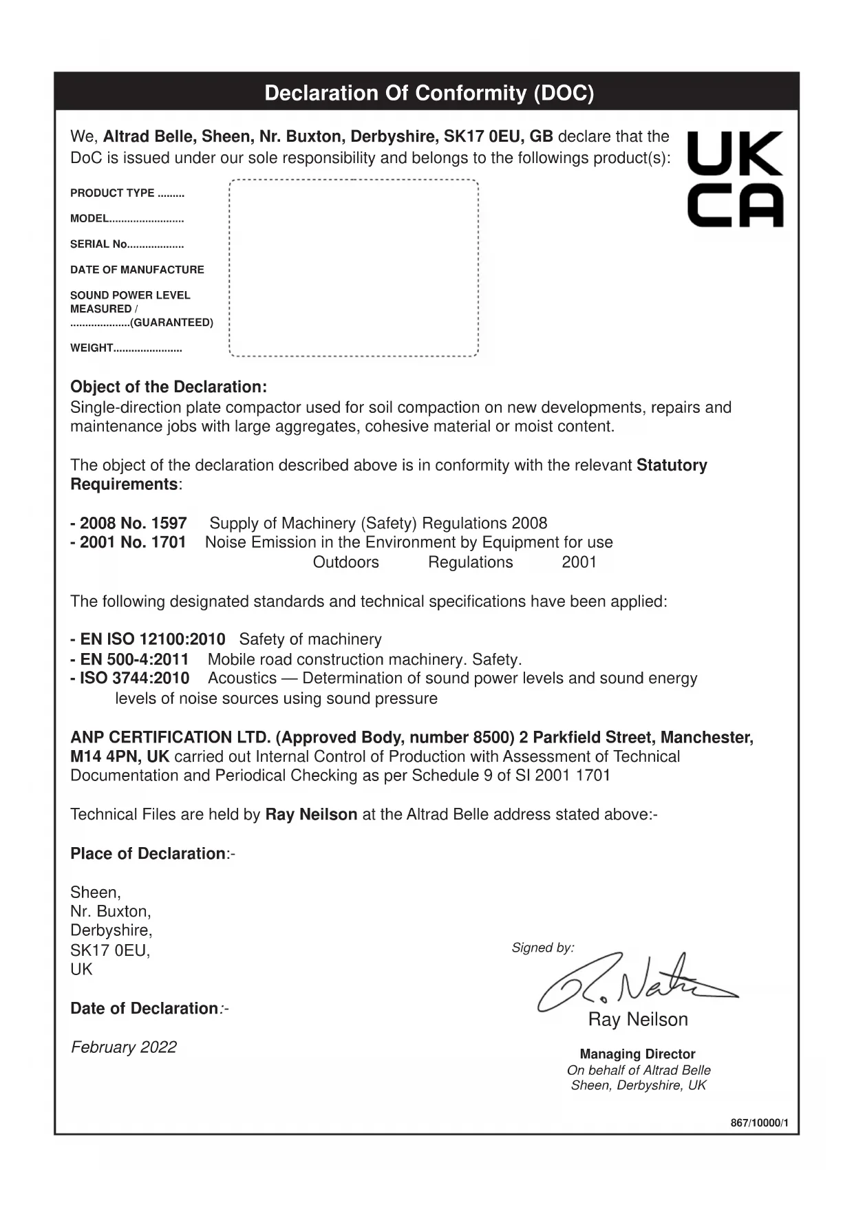 Date of Declaration:- February 20223 Managing DirectorOn behalf of Altrad BelleSheen, Derbyshire, UK EC Declaration Of Conformity (DOC) Ray Neilson Signed by: We, Altrad Belle, Sheen, Nr. Buxton, Derbyshire, SK17 0EU, GB declare that the DoC is issued under our sole responsibility and belongs to the followings product(s): 866/10000/0_GB GB GB PRODUCT TYPE .....................MODEL.....................................SERIAL No...............................DATE OF MANUFACTURE.....SOUND POWER LEVELMEASURED /....................(GUARANTEED)WEIGHT................................... Object of the Declaration: Single-direction plate compactor used for soil compaction on new developments, repairs and maintenance jobs with large aggregates, cohesive material or moist content. The object of the declaration described above is in conformity with the relevant Union Harmonisation Legislation: - 2006/42/EC New machinery directive - 2000/14/EC Noise - equipment for use outdoors The following harmonised standards and technical specifications have been applied: - EN ISO 12100:2010 Safety of machinery - EN 500-4:2011 Mobile road construction machinery. Safety. - ISO 3744:2010 Acoustics — Determination of sound power levels and sound energy levels of noise sources using sound pressure VINÇOTTE nv/sa (NB0026) carried out Internal Control of Production with Assessment of Technical Documentation and Periodical Checking as per Annex VI of 2000/14/EC Technical Files are held by Hugues Menager at the following address:- Altrad (Group Holding), 125 Rue du Mas Carbonnier, 34000, Montpellier, France. Place of Declaration:- Sheen, Nr. Buxton, Derbyshire, SK17 0EU,
