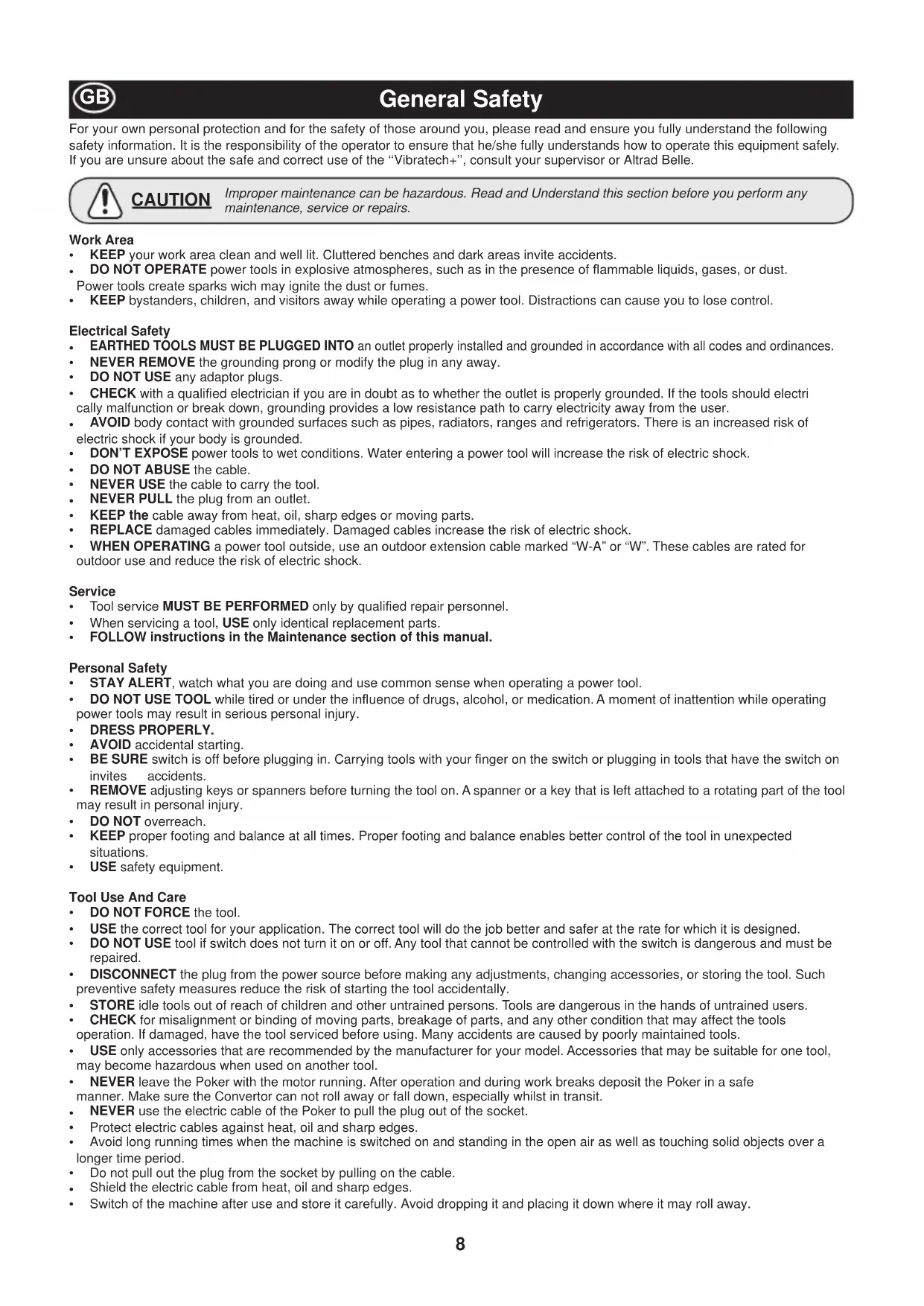 The Altrad Belle ‘Vibratech+’ is designed to give many years of trouble free operation. It is, however, important that the simple regular maintenance listed in this section is carried out. It is recommended that an approved Altrad Belle dealer carries out all major maintenance and repairs. Always use genuine Altrad Belle replacement parts, the use of spurious parts may void your warranty. Because of various risks with regards to cleanliness we advise against washing and then applying new grease onto used and disman- tled bearings during maintenance works and assembling them again. We recommend instead the use of original and new grooved ball bearings or Poker bearings from Altrad Belle; these are already greased as required. Service, connection and assembly may be accomplished only on the condition that:- Ɣ The electrical installation is dead. Ɣ Protected against reconnection. Ɣ All drives are in the STOP position. In switch-on position, electrical installations and machinery contain live, naked wires or rotating parts. This could result in personal injury and material damage should the covers and protection devices be removed contrary to regulations. This could also happen under wrong handling and maintenance or misapplication. Dealing with devices equipped with power electronics the expert might come accross another uncommon danger which so far he may not have encountered, i.e. the device still contains electrical voltage even after the supply voltage has been cut off.