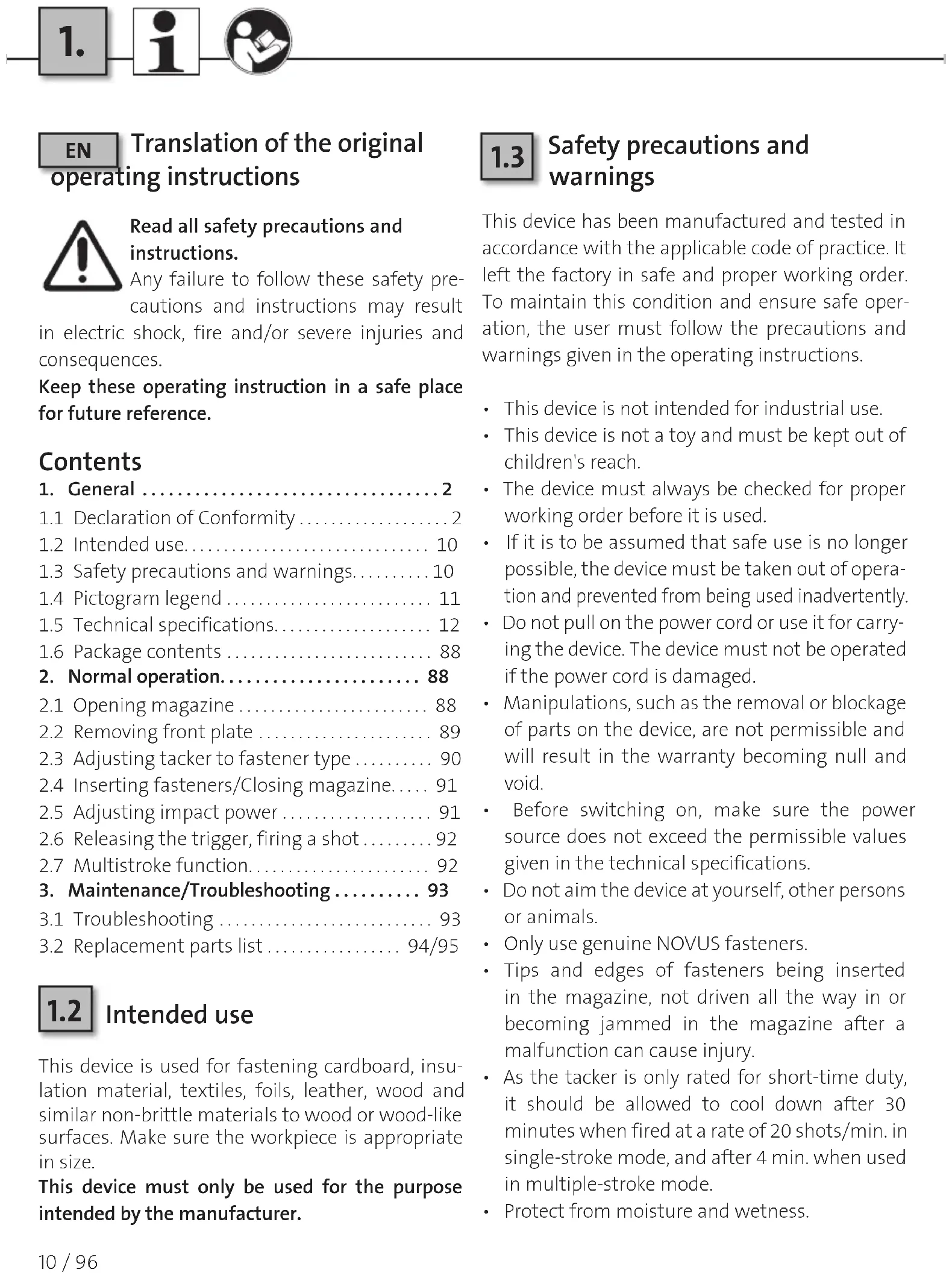 Intended use This device is used for fastening cardboard, insu- lation material, textiles, foils, leather, wood and similar non-brittle materials to wood or wood-like surfaces. Make sure the workpiece is appropriate in size. This device must only be used for the purpose intended by the manufacturer.