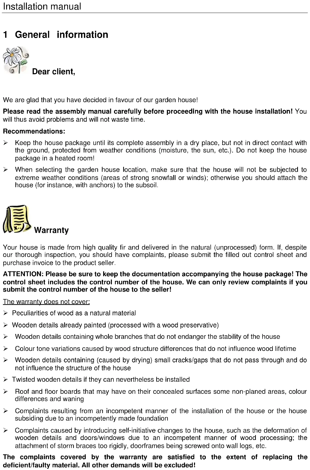 1 General information Dear client, We are glad that you have decided in favour of our garden house! Please read the assembly manual carefully before proceeding with the house installation! You will thus avoid problems and will not waste time. Recommendations: Keep the house package until its complete assembly in a dry place, but not in direct contact with the ground, protected from weather conditions (moisture, the sun, etc.). Do not keep the house package in a heated room! When selecting the garden house location, make sure that the house will not be subjected to extreme weather conditions (areas of strong snowfall or winds); otherwise you should attach the house (for instance, with anchors) to the subsoil. Warranty Your house is made from high quality fir and delivered in the natural (unprocessed) form. If, despite our thorough inspection, you should have complaints, please submit the filled out control sheet and purchase invoice to the product seller. ATTENTION: Please be sure to keep the documentation accompanying the house package! The control sheet includes the control number of the house. We can only review complaints if you submit the control number of the house to the seller! The warranty does not cover: Peculiarities of wood as a natural material Wooden details already painted (processed with a wood preservative) Wooden details containing whole branches that do not endanger the stability of the house Colour tone variations caused by wood structure differences that do not influence wood lifetime Wooden details containing (caused by drying) small cracks/gaps that do not pass through and do not influence the structure of the house Twisted wooden details if they can nevertheless be installed Roof and floor boards that may have on their concealed surfaces some non-planed areas, colour differences and waning Complaints resulting from an incompetent manner of the installation of the house or the house subsiding due to an incompetently made foundation Complaints caused by introducing self-initiative changes to the house, such as the deformation of wooden details and doors/windows due to an incompetent manner of wood processing; the attachment of storm braces too rigidly, doorframes being screwed onto wall logs, etc. The complaints covered by the warranty are satisfied to the extent of replacing the deficient/faulty material. All other demands will be excluded!Installation manual