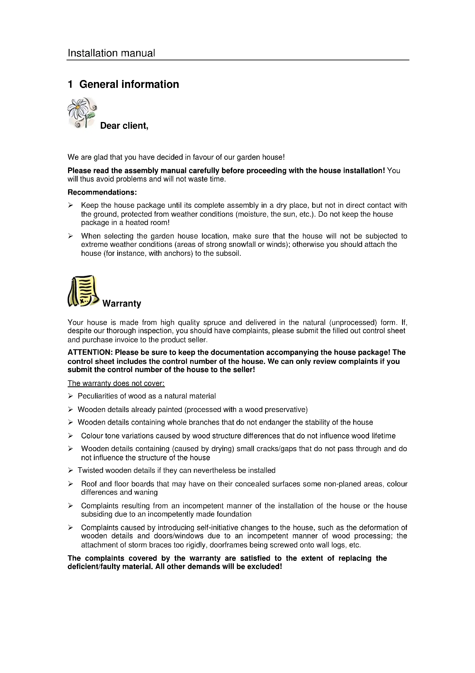 1 General information Dear client, We are glad that you have decided in favour of our garden house! Please read the assembly manual carefully before proceeding with the house installation! You will thus avoid problems and will not waste time. Recommendations: Keep the house package until its complete assembly in a dry place, but not in direct contact with the ground, protected from weather conditions (moisture, the sun, etc.). Do not keep the house package in a heated room! When selecting the garden house location, make sure that the house will not be subjected to extreme weather conditions (areas of strong snowfall or winds); otherwise you should attach the house (for instance, with anchors) to the subsoil. Warranty Your house is made from high quality spruce and delivered in the natural (unprocessed) form. If, despite our thorough inspection, you should have complaints, please submit the filled out control sheet and purchase invoice to the product seller. ATTENTION: Please be sure to keep the documentation accompanying the house package! The control sheet includes the control number of the house. We can only review complaints if you submit the control number of the house to the seller! The warranty does not cover: Peculiarities of wood as a natural material Wooden details already painted (processed with a wood preservative) Wooden details containing whole branches that do not endanger the stability of the house Colour tone variations caused by wood structure differences that do not influence wood lifetime Wooden details containing (caused by drying) small cracks/gaps that do not pass through and do not influence the structure of the house Twisted wooden details if they can nevertheless be installed Roof and floor boards that may have on their concealed surfaces some non-planed areas, colour differences and waning Complaints resulting from an incompetent manner of the installation of the house or the house subsiding due to an incompetently made foundation Complaints caused by introducing self-initiative changes to the house, such as the deformation of wooden details and doors/windows due to an incompetent manner of wood processing; the attachment of storm braces too rigidly, doorframes being screwed onto wall logs, etc. The complaints covered by the warranty are satisfied to the extent of replacing the deficient/faulty material. All other demands will be excluded!Installation manual