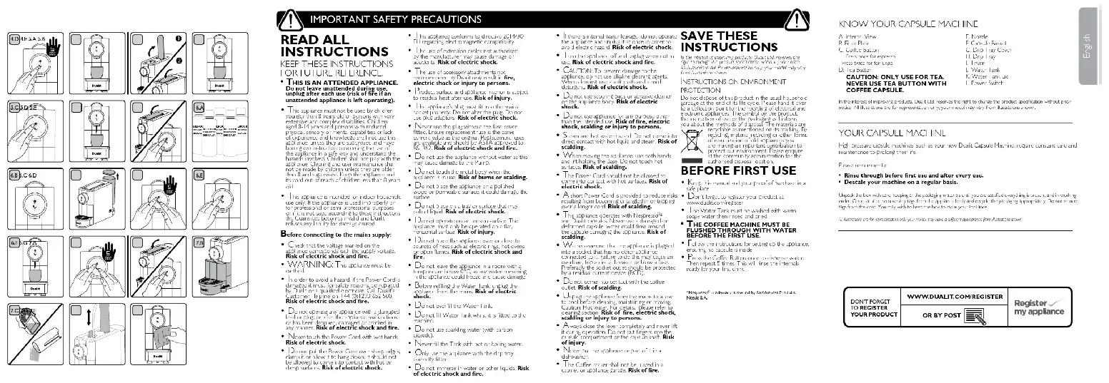 and Dualit capsules. Never use a damaged or deformed capsule; water could ow around the capsule damaging the appliance. Risk of scalding.