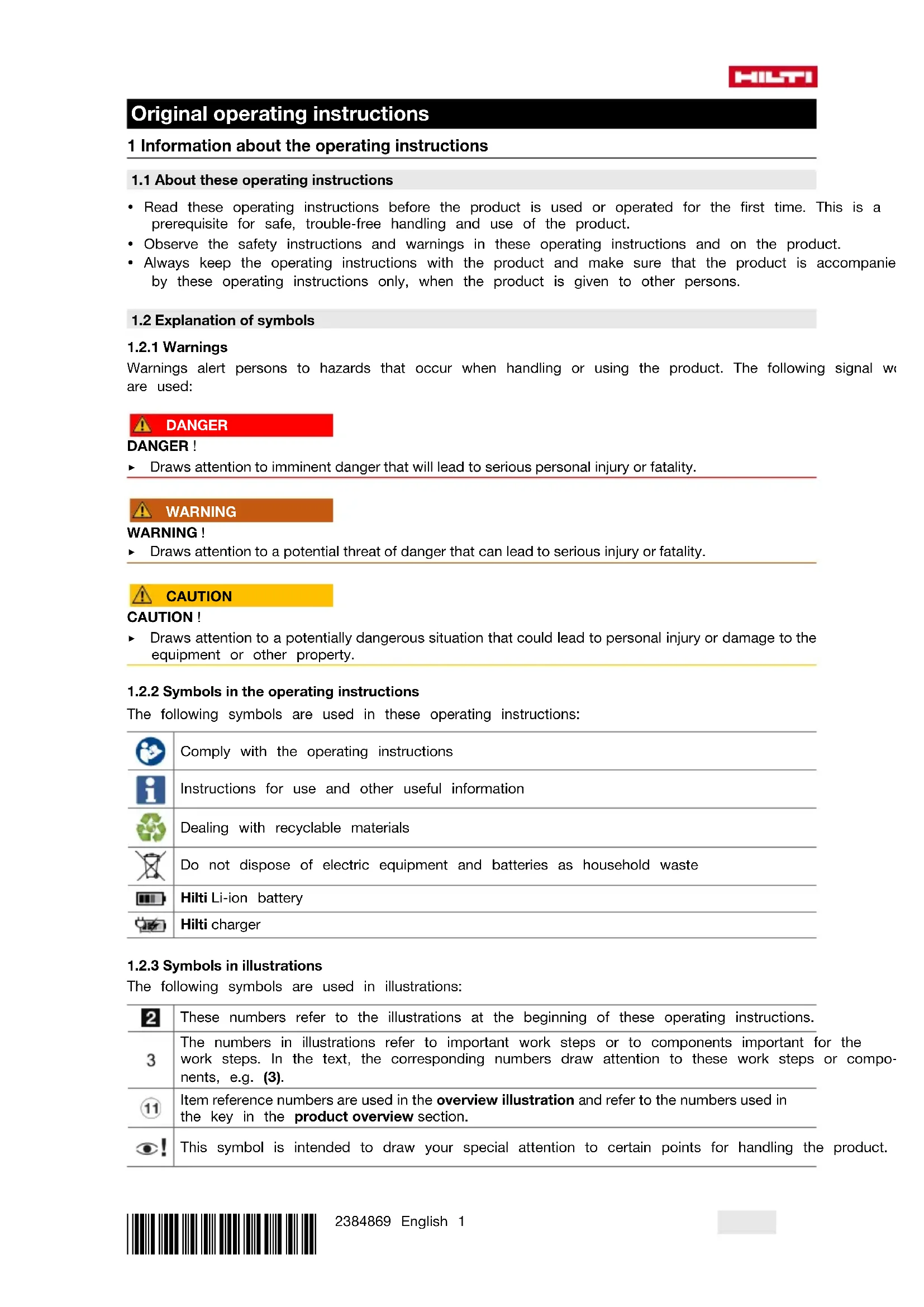 ▶ Comply with the following safety instructions for the safe handling and use of Li-ion batteries. Failure to comply can lead to skin irritation, severe corrosive injury, chemical burns, fire and/or explosion. ▶ Use only batteries that are in perfect working order. ▶ Treat batteries with care in order to avoid damage and prevent leakage of fluids that are extremely harmful to health! ▶ Do not under any circumstances modify or tamper with batteries! ▶ Do not disassemble, crush or incinerate batteries and do not subject them to temperatures over 80 °C (176 °F). ▶ Never use or charge a battery that has suffered an impact or been damaged in any other way. Check your batteries regularly for signs of damage. ▶ Never use recycled or repaired batteries. ▶ Never use the battery or a battery-operated power tool as a striking tool. ▶ Never expose batteries to the direct rays of the sun, elevated temperature, sparking, or open flame. This can lead to explosions. ▶ Do not touch the battery poles with your fingers, tools, jewelry, or other electrically conductive objects. This can damage the battery and also cause material damage and personal injury. ▶ Keep batteries away from rain, moisture and liquids. Penetrating moisture can cause short circuits, electric shock, burns, fire and explosions. ▶ Use only chargers and power tools approved for the specific battery type. Read and follow the relevant operating instructions. ▶ Do not use or store the battery in explosive environments. ▶ If the battery is too hot to touch, it may be defective. Put the battery in a place where it is clearly visible and where there is no risk of fire, at an adequate distance from flammable materials. Allow the battery to cool down. If it is still too hot to touch after an hour, the battery is faulty. Consult Hilti Service or read the document entitled "Instructions on safety and use for Hilti Li-ion batteries". Observe the special guidelines applicable to the transport, storage and use of lithium-ion batteries. Read the instructions on safety and use of Hilti Li-ion batteries that you can access by scanning the QR code at the end of these operating instructions.4 English 2384869 *2384869* 3 Description