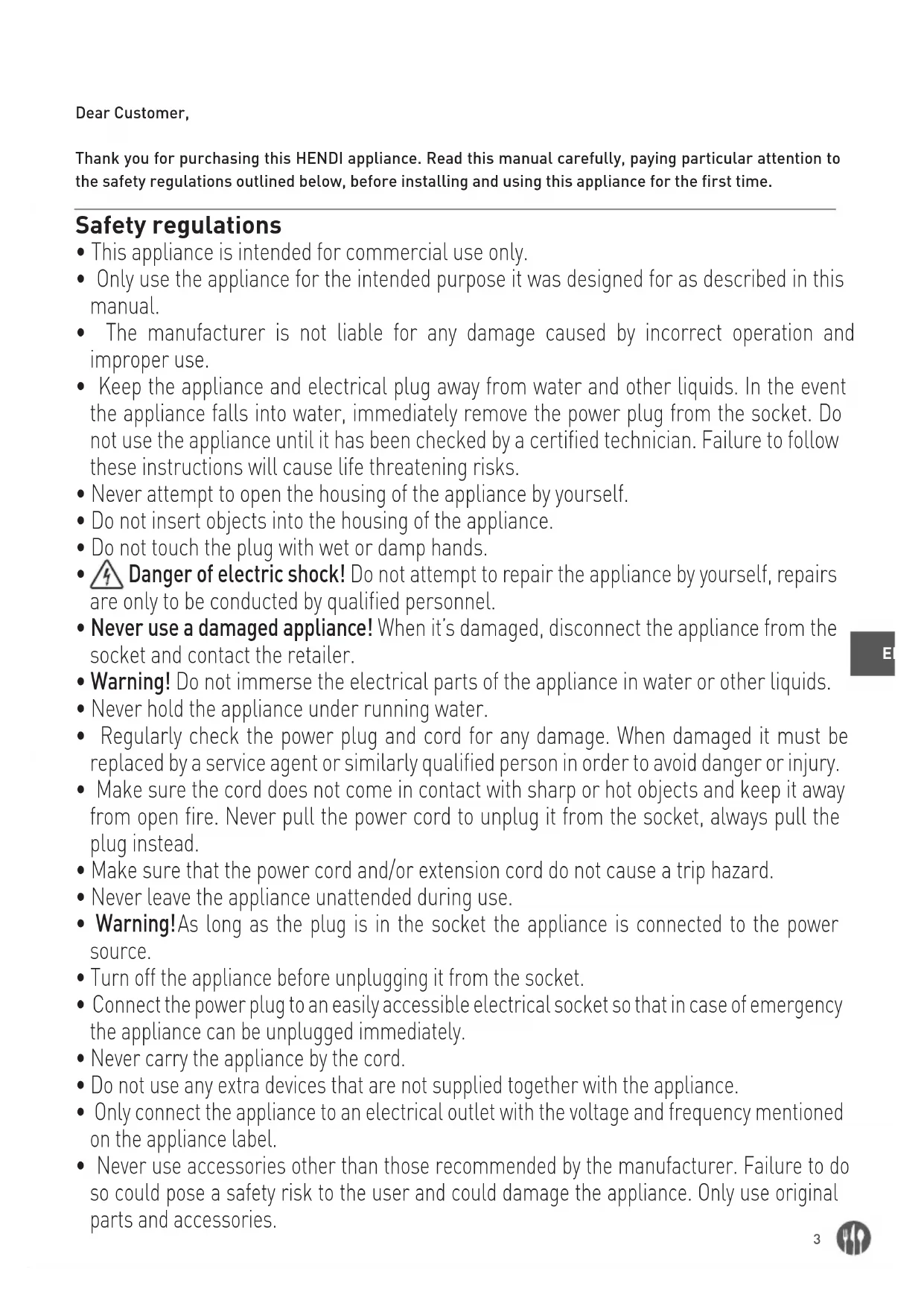 - This appliance is intended for commercial use only.