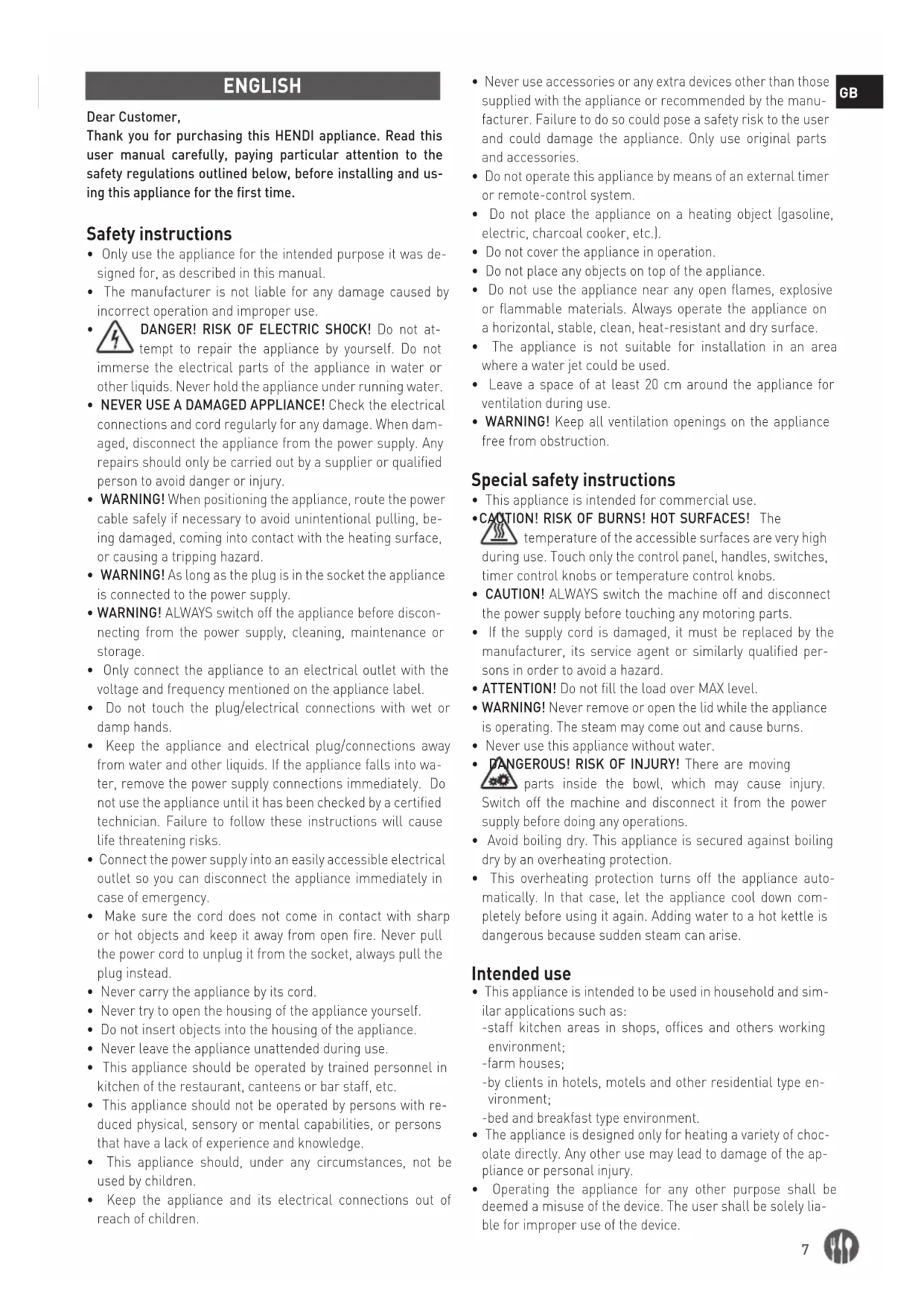 ENGLISH Dear Customer, Thank you for purchasing this HENDI appliance. Read this user manual carefully, paying particular attention to the safety regulations outlined below, before installing and us- ing this appliance for the first time. Safety instructions