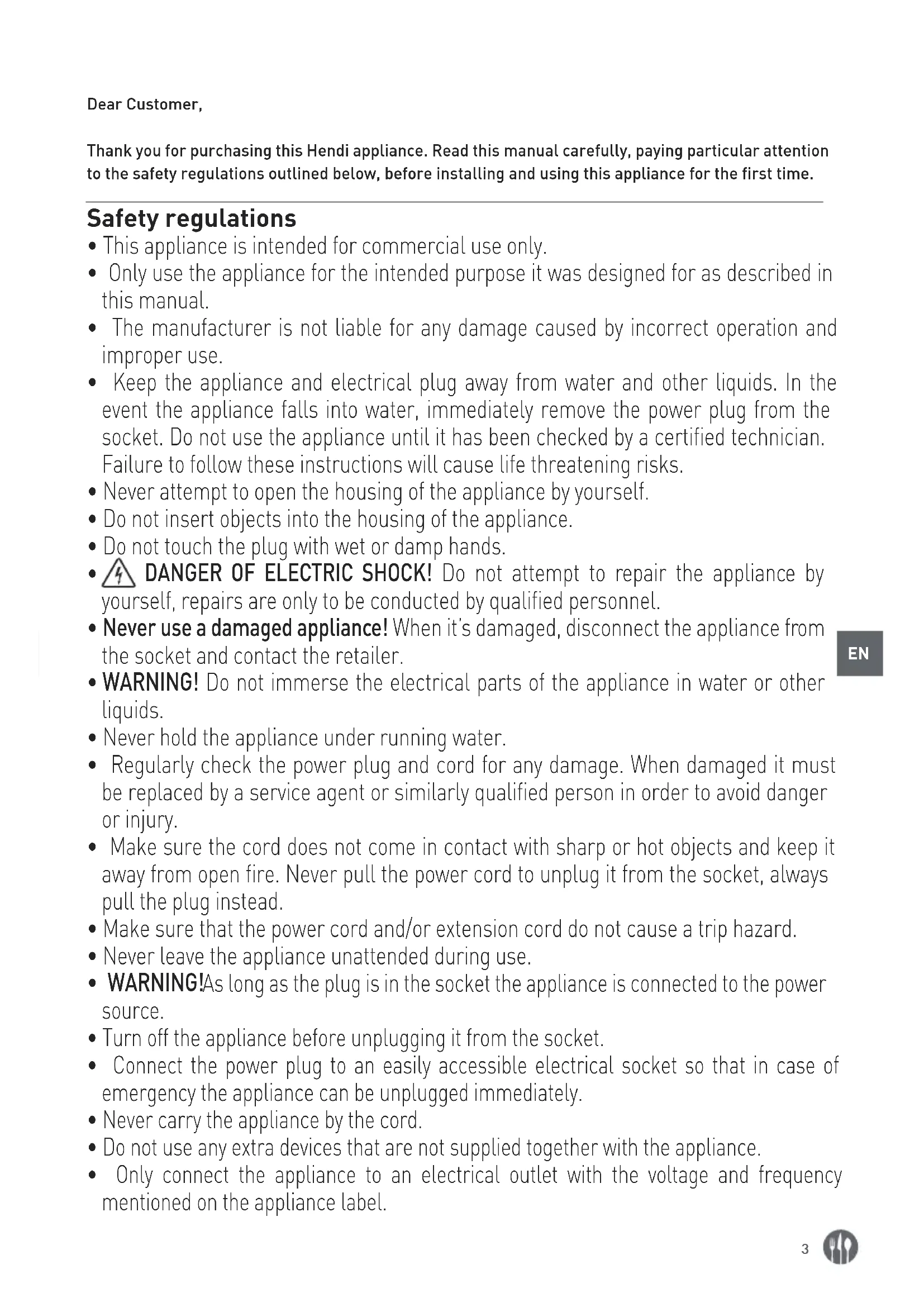 Dear Customer, Thank you for purchasing this Hendi appliance. Read this manual carefully, paying particular attention to the safety regulations outlined below, before installing and using this appliance for the first time. Safety regulations
