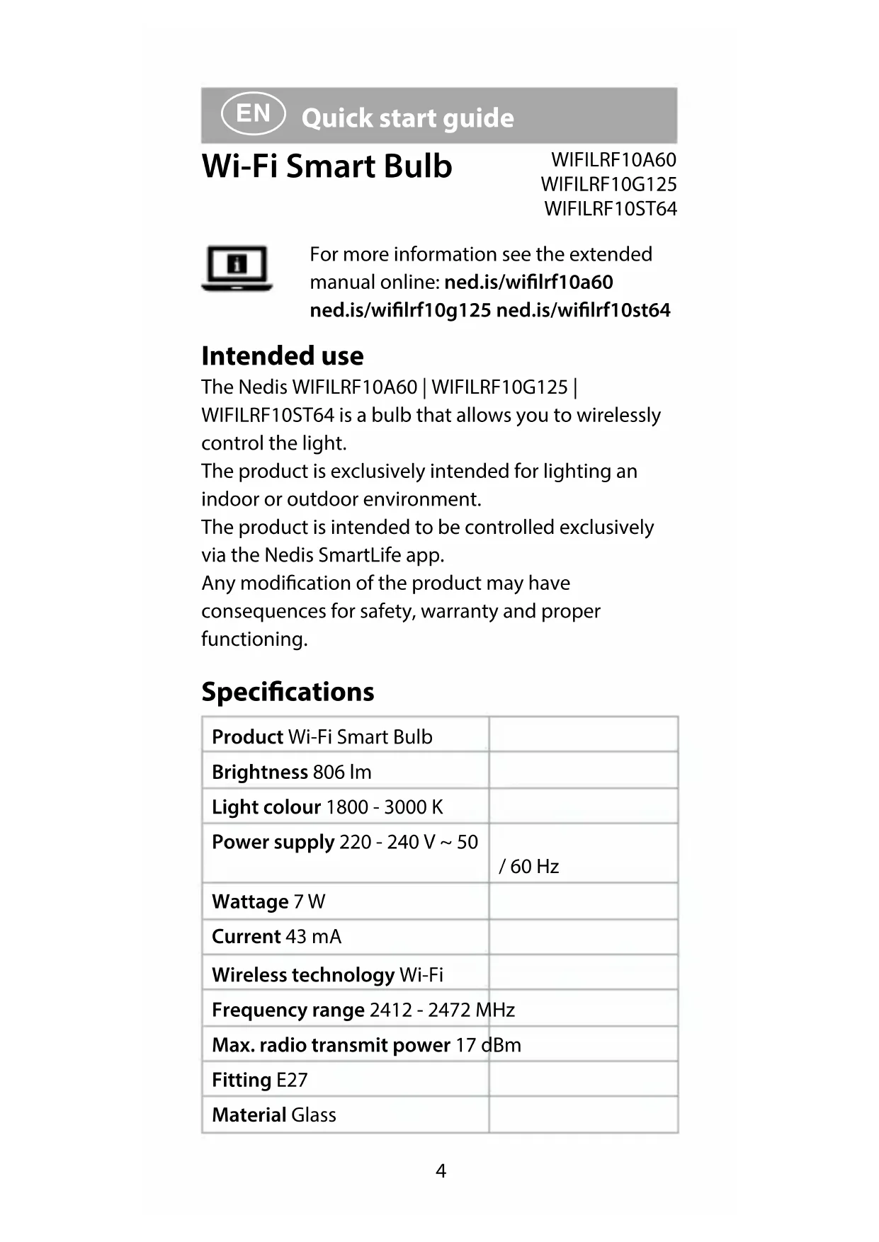 Quick start guide Wi-Fi Smart Bulb WIFILRF10A60 WIFILRF10G125 WIFILRF10ST64 For more information see the extended manual online: ned.is/wilrf10a60 ned.is/wilrf10g125 ned.is/wilrf10st64 Intended use The Nedis WIFILRF10A60 | WIFILRF10G125 | WIFILRF10ST64 is a bulb that allows you to wirelessly control the light. The product is exclusively intended for lighting an indoor or outdoor environment. The product is intended to be controlled exclusively via the Nedis SmartLife app. Any modication of the product may have consequences for safety, warranty and proper functioning. Specications Product Wi-Fi Smart Bulb Brightness 806 lm Light colour 1800 - 3000 K Power supply 220 - 240 V ~ 50 / 60 Hz Wattage 7 W Current 43 mA Wireless technology Wi-Fi Frequency range 2412 - 2472 MHz Max. radio transmit power 17 dBm Fitting E27 Material Glass5 Article number Dimensions Weight WIFILRF10A60 Ø 60 x 105 mm 30 g WIFILRT10G125 Ø 125 x 172 mm 100 g WIFILRF10ST64 Ø 64 x 142 mm 46 g Main parts (image A) 1 Bulb 2 Filament 3 Electric contact Safety instructions
