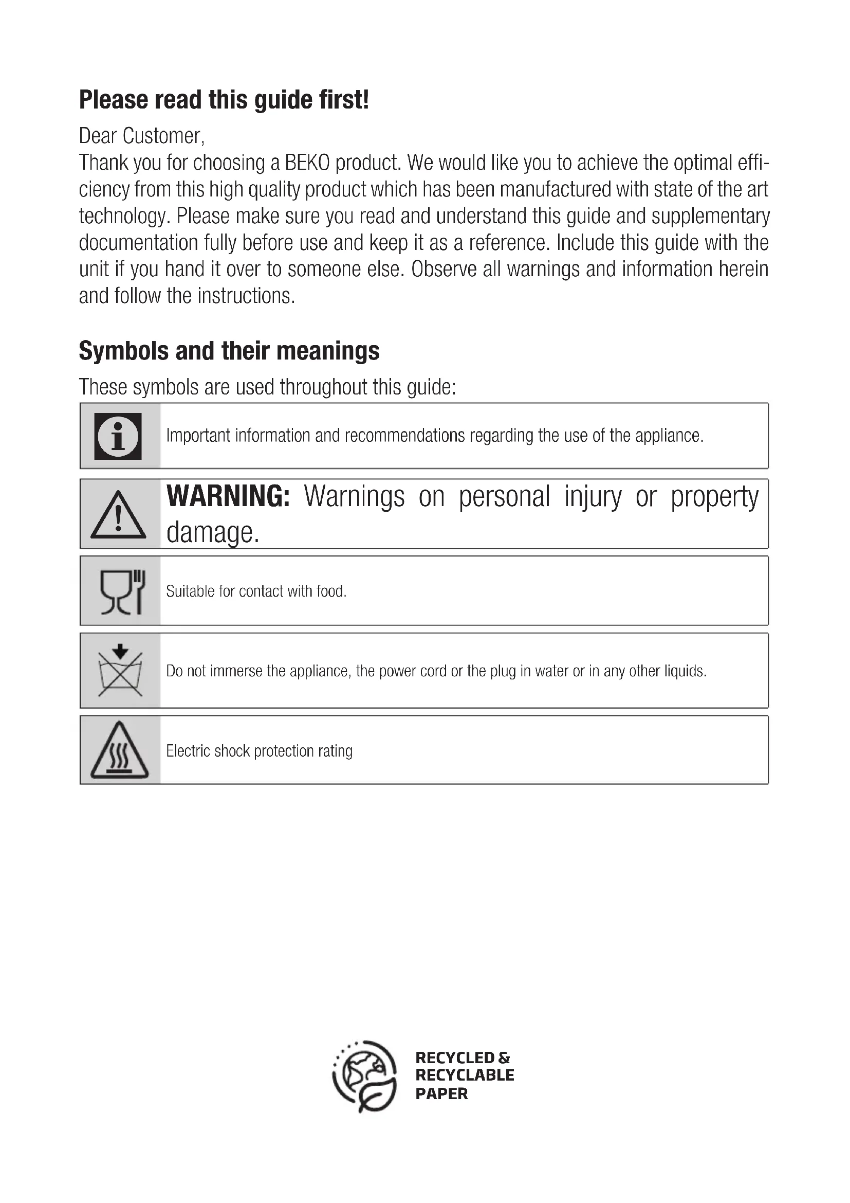 ITALIANO 76-90 POLSKI 91-105 СРБИН 106-119Please read this guide first! Dear Customer, Thank you for choosing a BEKO product. We would like you to achieve the optimal effi- ciency from this high quality product which has been manufactured with state of the art technology. Please make sure you read and understand this guide and supplementary documentation fully before use and keep it as a reference. Include this guide with the unit if you hand it over to someone else. Observe all warnings and information herein and follow the instructions. Symbols and their meanings These symbols are used throughout this guide: