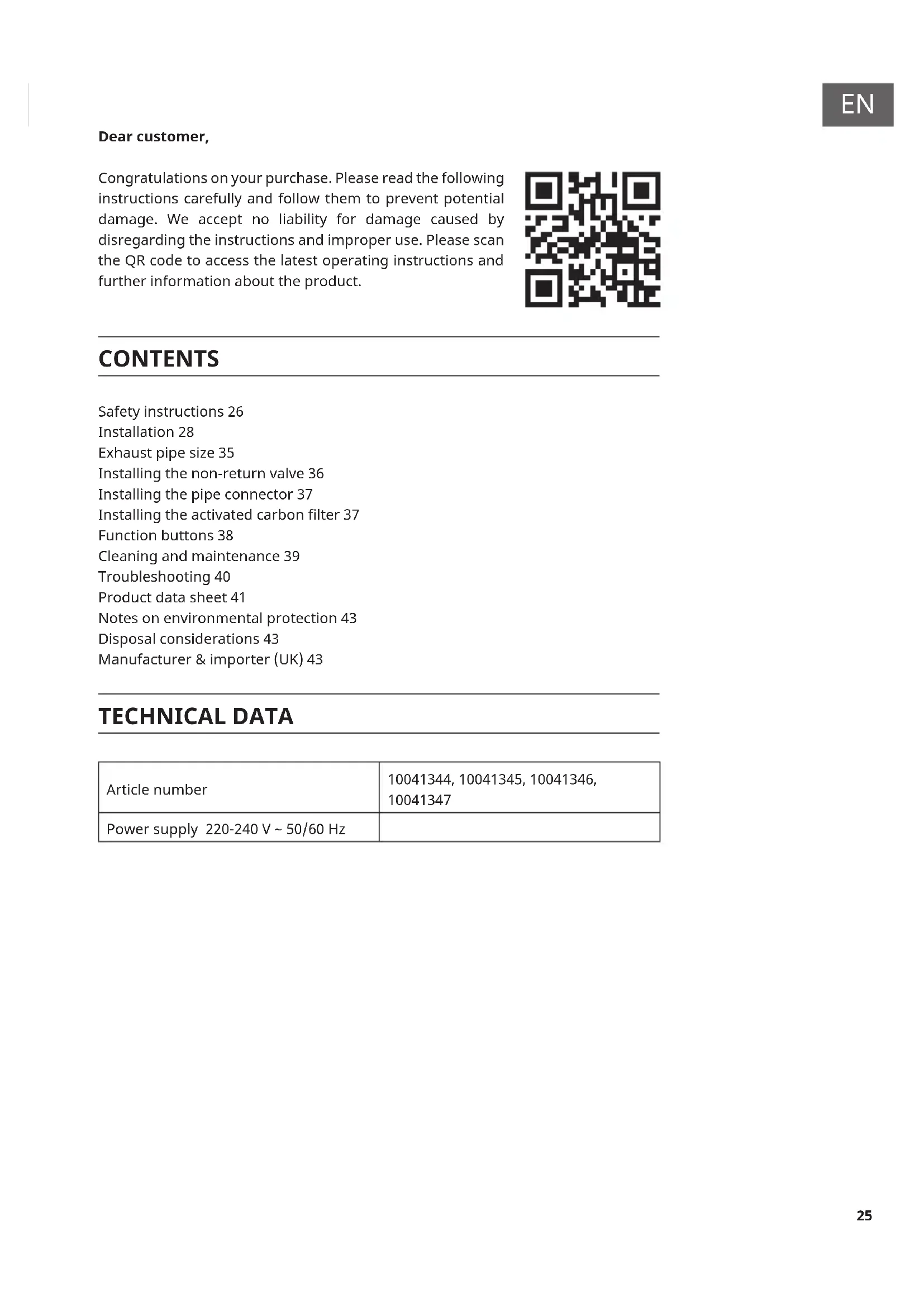 Dear customer, Congratulations on your purchase. Please read the following instructions carefully and follow them to prevent potential damage. We accept no liability for damage caused by disregarding the instructions and improper use. Please scan the QR code to access the latest operating instructions and further information about the product. CONTENTS Safety instructions 26 Installation 28 Exhaust pipe size 35 Installing the non-return valve 36 Installing the pipe connector 37 Installing the activated carbon lter 37 Function buttons 38 Cleaning and maintenance 39 Troubleshooting 40 Product data sheet 41 Notes on environmental protection 43 Disposal considerations 43 Manufacturer & importer (UK) 43 TECHNICAL DATA Article number 10041344, 10041345, 10041346,