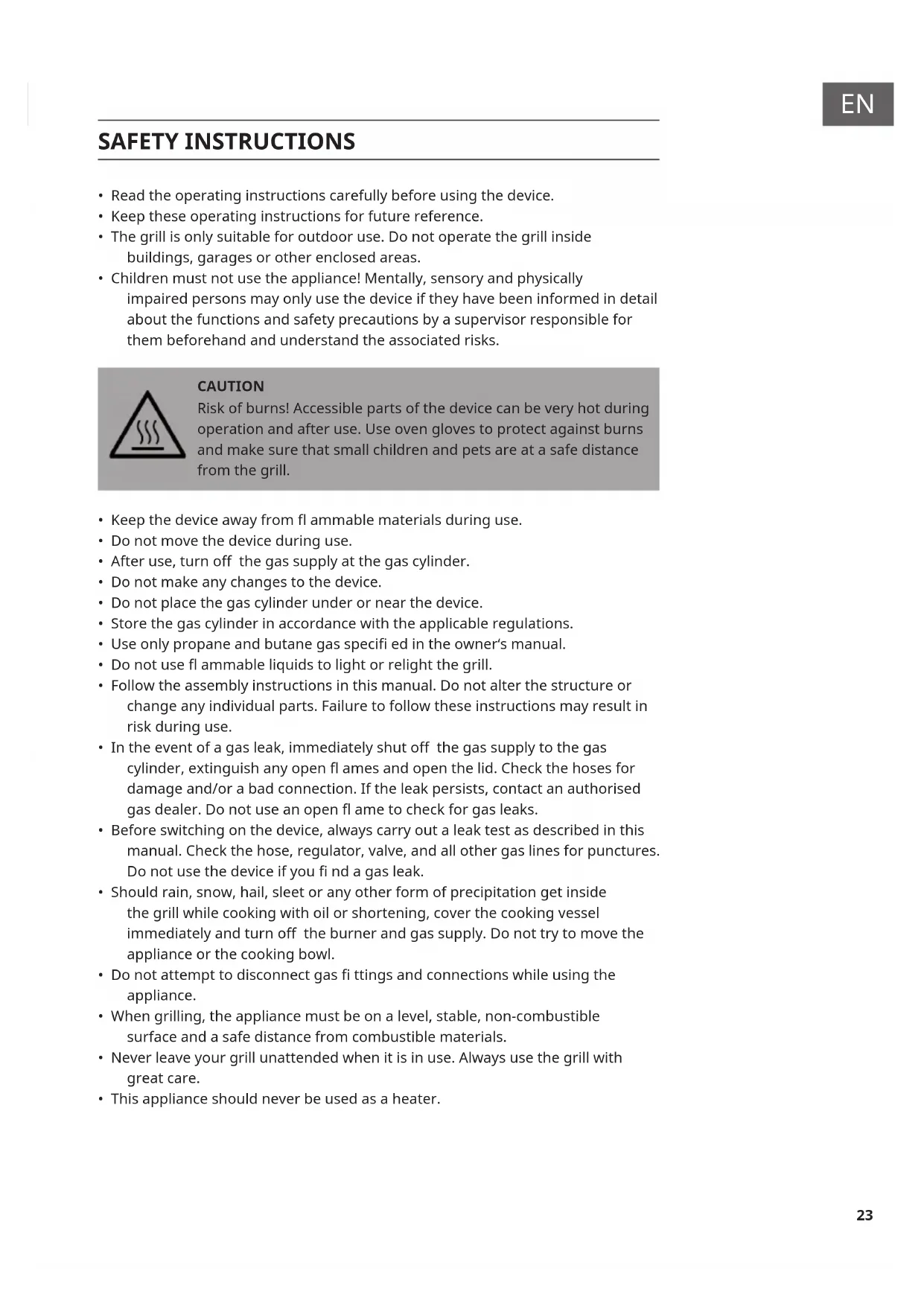 - Keep children and pets away from the grill. WARNING Danger of re and explosion! Do not use petrol or spirits to light or relight! Only use relighters that comply with EN 1860-3!