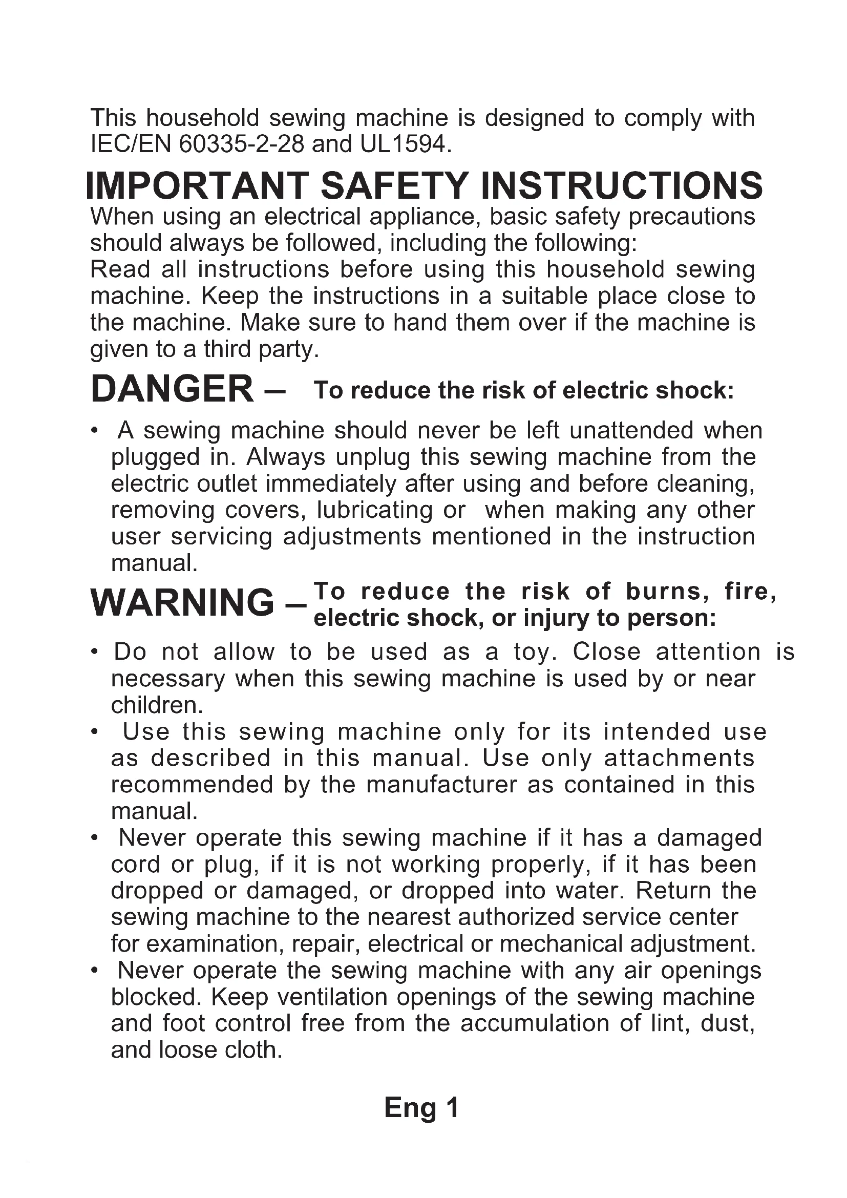 C5200Eng 1 This household sewing machine is designed to comply with IEC/EN 60335-2-28 and UL1594. When using an electrical appliance, basic safety precautions should always be followed, including the following: Read all instructions before using this household sewing machine. Keep the instructions in a suitable place close to the machine. Make sure to hand them over if the machine is given to a third party.