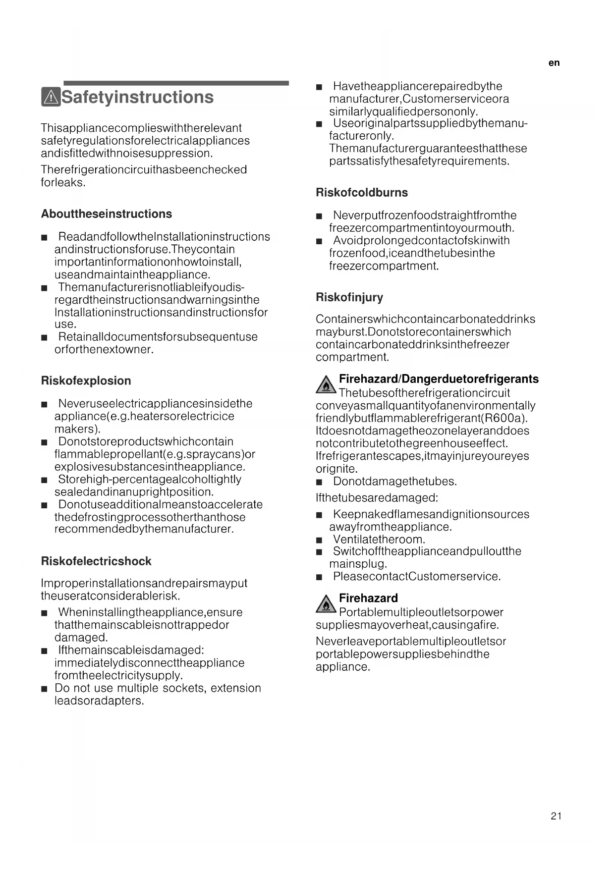 ( Safety instructions This appliance complies with the relevant safety regulations for electrical appliances and is fitted with noise suppression. The refrigeration circuit has been checked for leaks. About these instructions Ø Read and follow the Installation instructions and instructions for use. They contain important information on how to install, use and maintain the appliance. Ø The manufacturer is not liable if you dis regard the instructions and warnings in the Installation instructions and instructions for use. Ø Retain all documents for subsequent use or for the next owner. Risk of explosion Ø Never use electric appliances inside the appliance (e.g. heaters or electric ice makers). Ø Do not store products which contain flammable propellant (e.g. spray cans) or explosive substances in the appliance. Ø Store high-percentage alcohol tightly sealed and in an upright position. Ø Do not use additional means to accelerate the defrosting process other than those recommended by the manufacturer. Risk of electric shock Improper installations and repairs may put the user at considerable risk. Ø When installing the appliance, ensure that the mains cable is not trapped or damaged. Ø If the mains cable is damaged: immediately disconnect the appliance from the electricity supply. Ø Do not u se mu ltiple sockets, extension leads or adapters. Ø Have the appliance repaired by the manufacturer, Customer service or a similarly qualified person only. Ø Use original parts supplied by the manu facturer only. The manufacturer guarantees that these parts satisfy the safety requirements. Risk of cold burns Ø Never put frozen food straight from the freezer compartment into your mouth. Ø Avoid prolonged contact of skin with frozen food, ice and the tubes in the freezer compartment. Risk of injury Containers which contain carbonated drinks may burst. Do not store containers which contain carbonated drinks in the freezer compartment. Fire hazard / Danger due to refrigerants The tubes of the refrigeration circuit convey a small quantity of an environmentally friendly but f lammable refrigerant (R600a). It does not damage the ozone layer and does not contribute to the greenhouse effect. If refrigerant escapes, it may injure your eyes or ignite. Ø Do not damage the tubes. If the tubes are damaged: Ø Keep naked flames and ignition sources away from the appliance. Ø Ventilate the room. Ø Switch off the appliance and pull out the mains plug. Ø Please contact Customer service. Fire hazard Portable multiple outlets or power supplies may overheat, causing a fire. Never leave portable multiple outlets or portable power supplies behind the appliance.en