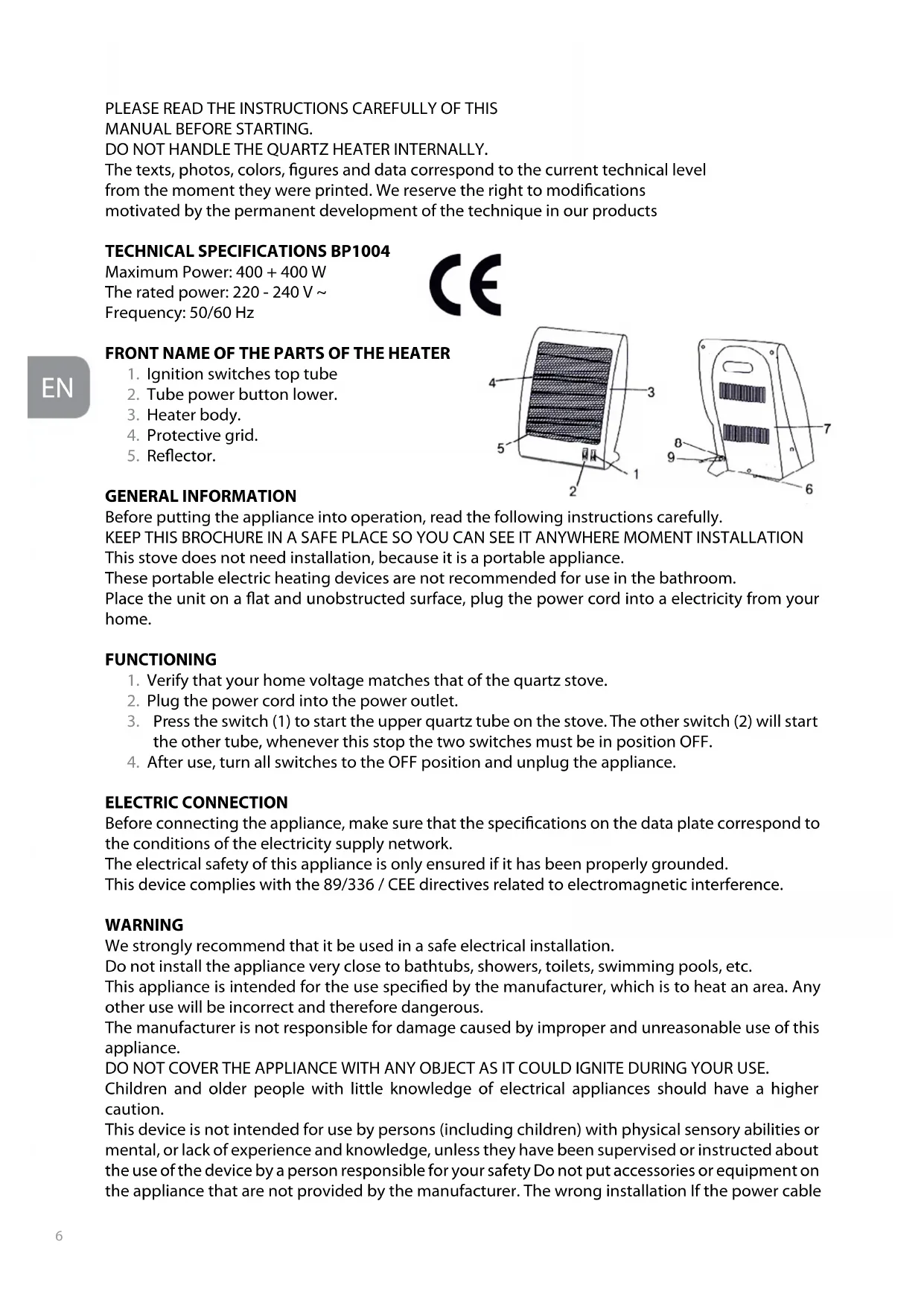PLEASE READ THE INSTRUCTIONS CAREFULLY OF THIS MANUAL BEFORE STARTING. DO NOT HANDLE THE QUARTZ HEATER INTERNALLY. The texts, photos, colors, gures and data correspond to the current technical level from the moment they were printed. We reserve the right to modications motivated by the permanent development of the technique in our products
