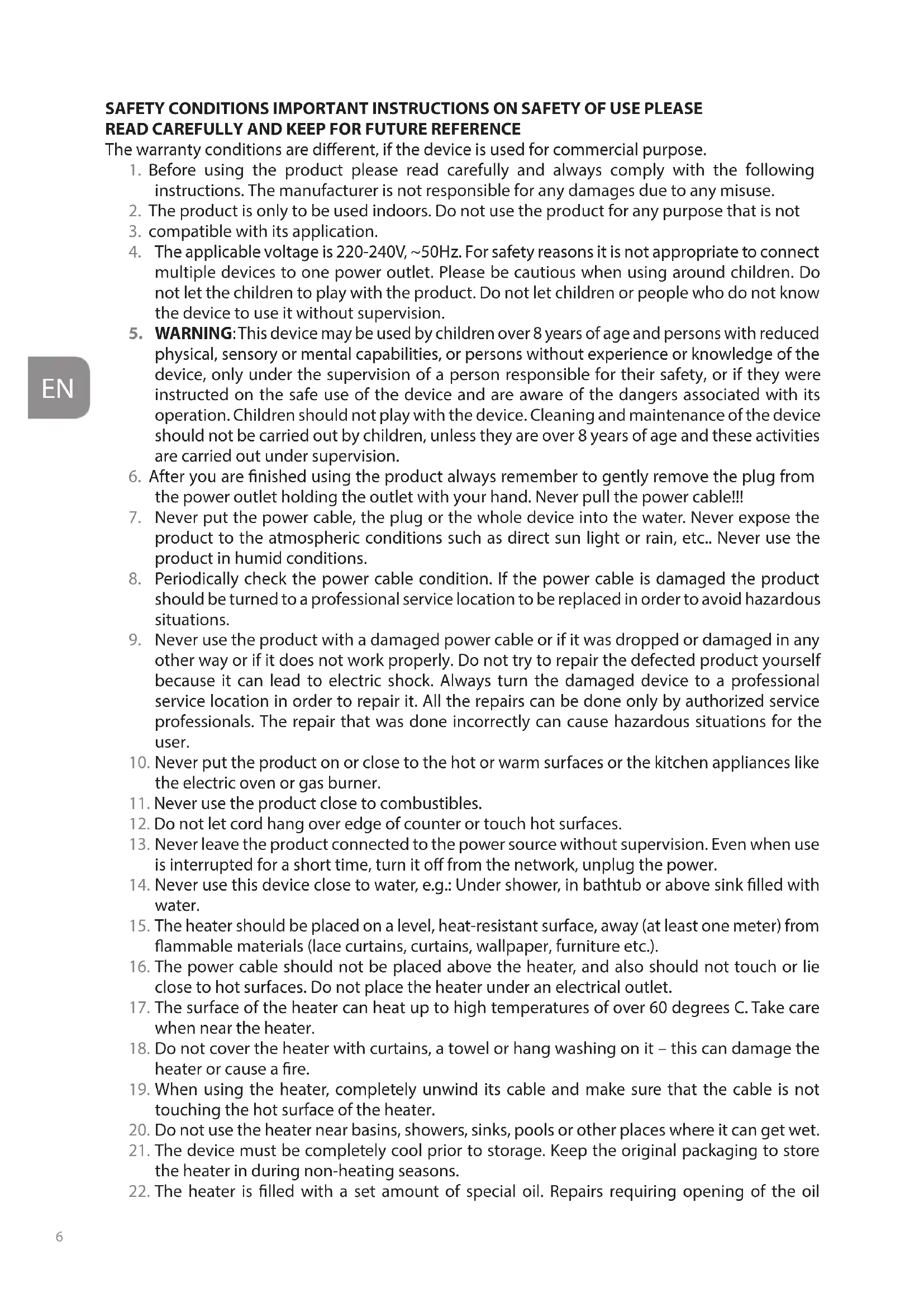 1. Place the oil heater a minimum of 100 cm from walls, furniture, curtains, plants etc.