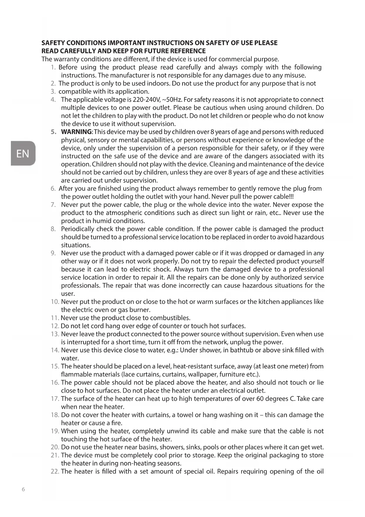 1. Place the oil heater a minimum of 100 cm from walls, furniture, curtains, plants etc.