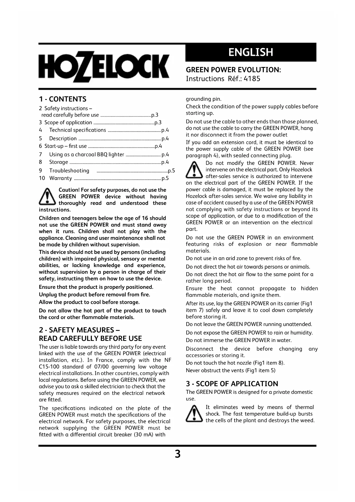 2 Safety instructions – read carefully before use .............................................p.3 3 Scope of application ......................................................p.3 4 Technical specifications ............................................... p.4 5 Description .........................................................................p.4 6 Start-up – first use ...........................................................p.4 7 Using as a charcoal BBQ lighter ............................... p.4 8 Storage .................................................................................p.4 9 Troubleshooting ...............................................................p.5 10 Warranty ............................................................................. p.5 Caution! For safety purposes, do not use the GREEN POWER device without having thoroughly read and understood these instructions. Children and teenagers below the age of 16 should not use the GREEN POWER and must stand away when it runs. Children shall not play with the appliance. Cleaning and user maintenance shall not be made by children without supervision. This device should not be used by persons (including children) with impaired physical, sensory or mental abilities, or lacking knowledge and experience, without supervision by a person in charge of their safety, instructing them on how to use the device. Ensure that the product is properly positioned. Unplug the product before removal from fire. Allow the product to cool before storage. Do not allow the hot part of the product to touch the cord or other flammable materials.