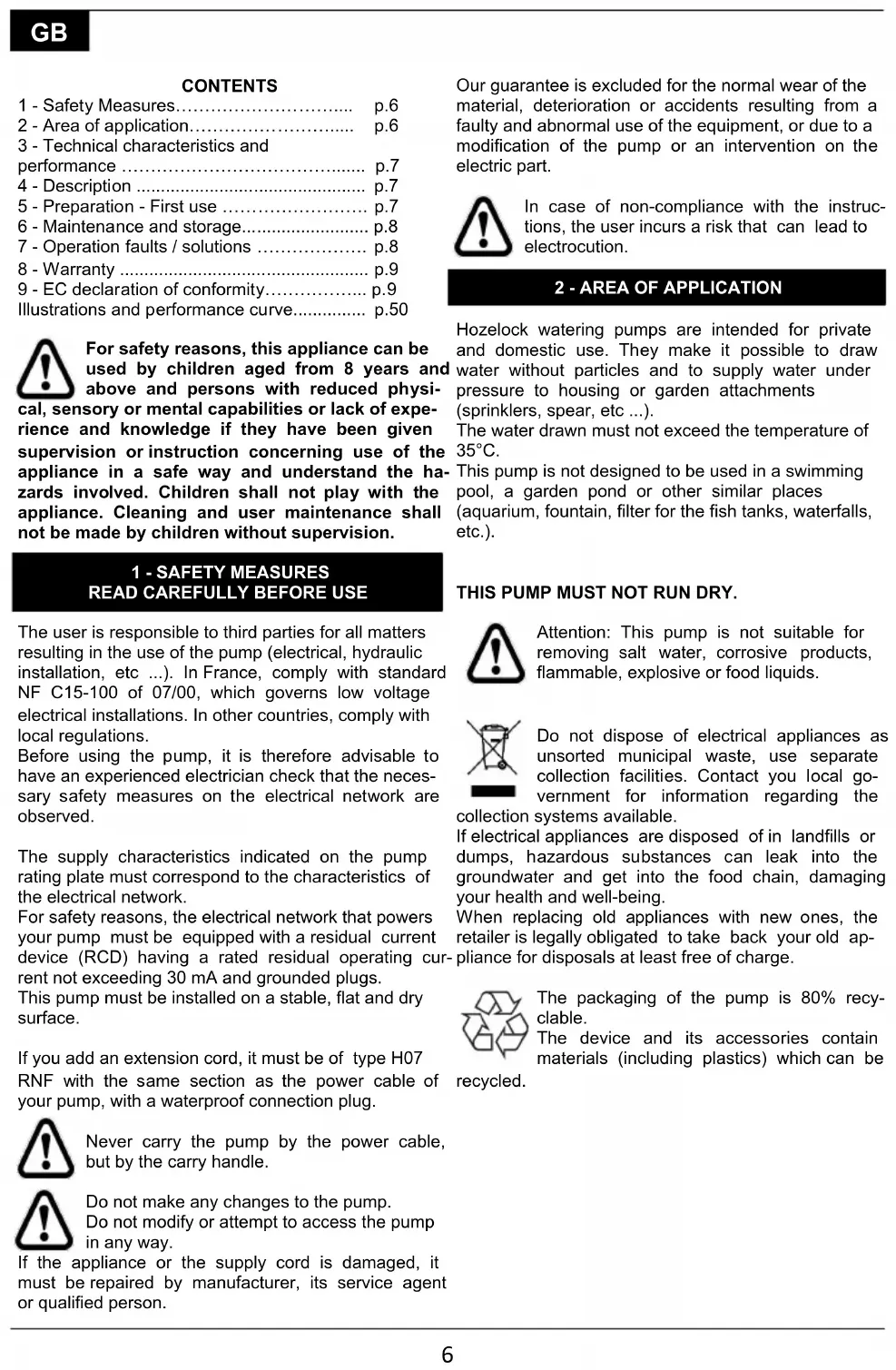 For any other anomaly, contact our after-sales service. For safety reasons, only the Hozelock-Exel after-sales service is entitled to disassemble the pump.9
